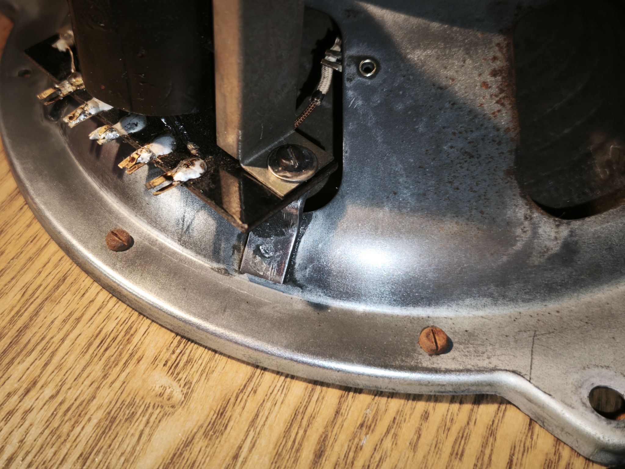 On dirait une réparation/rectification d’usine après démoulage de la bakélite. Je suis curieux de connaître le phénomène exact car la philite semble s’oxyder ?