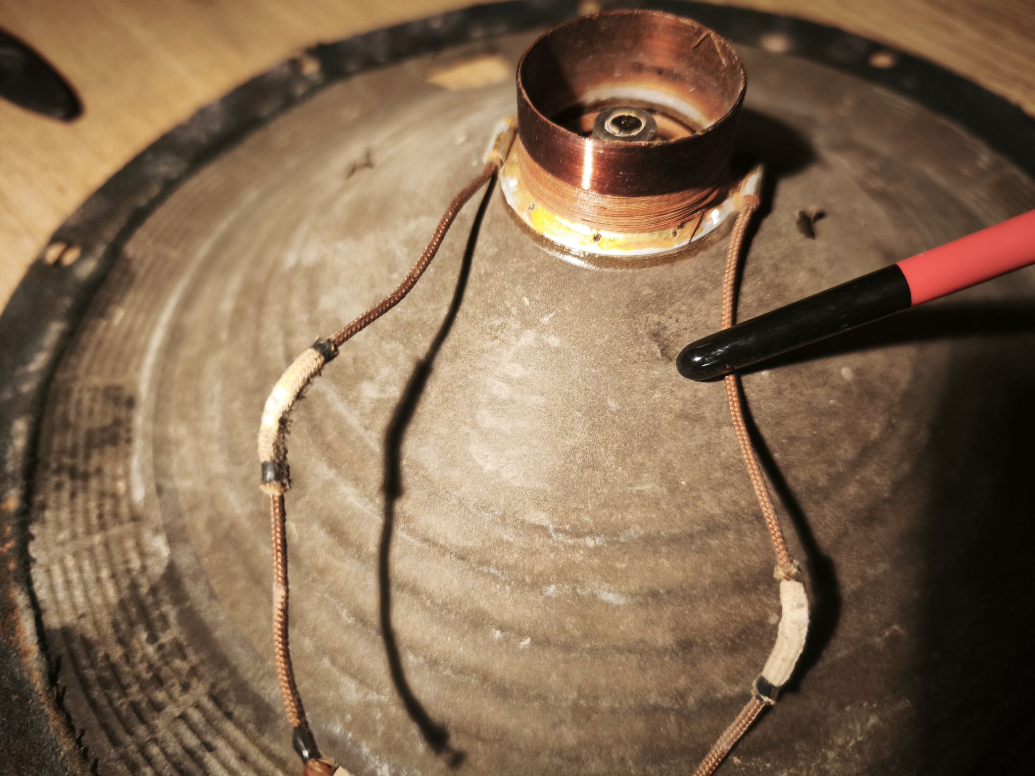 Ensuite, déconnectez les fils de la bobine du cône (sous la plaquette du transformateur). Il faudra également dégrafer les deux attaches métalliques qui retiennent les fils de la bobine du cône (attention, elles sont très fragiles et se cassent facilement) :