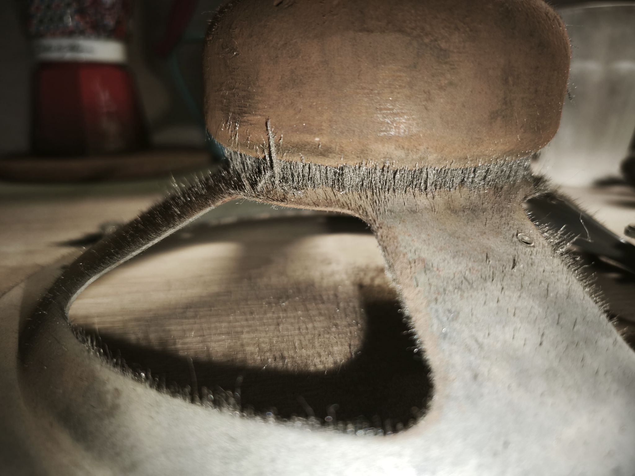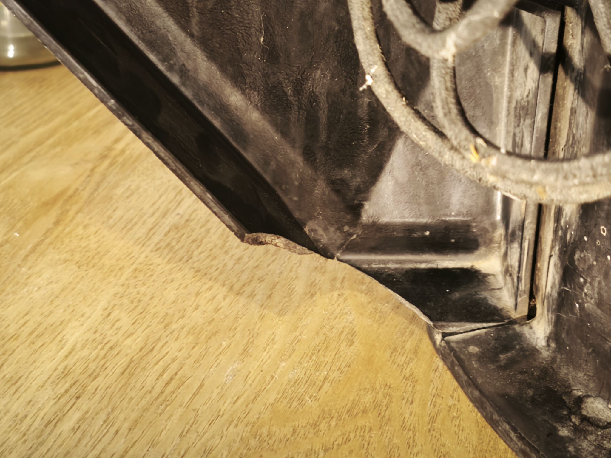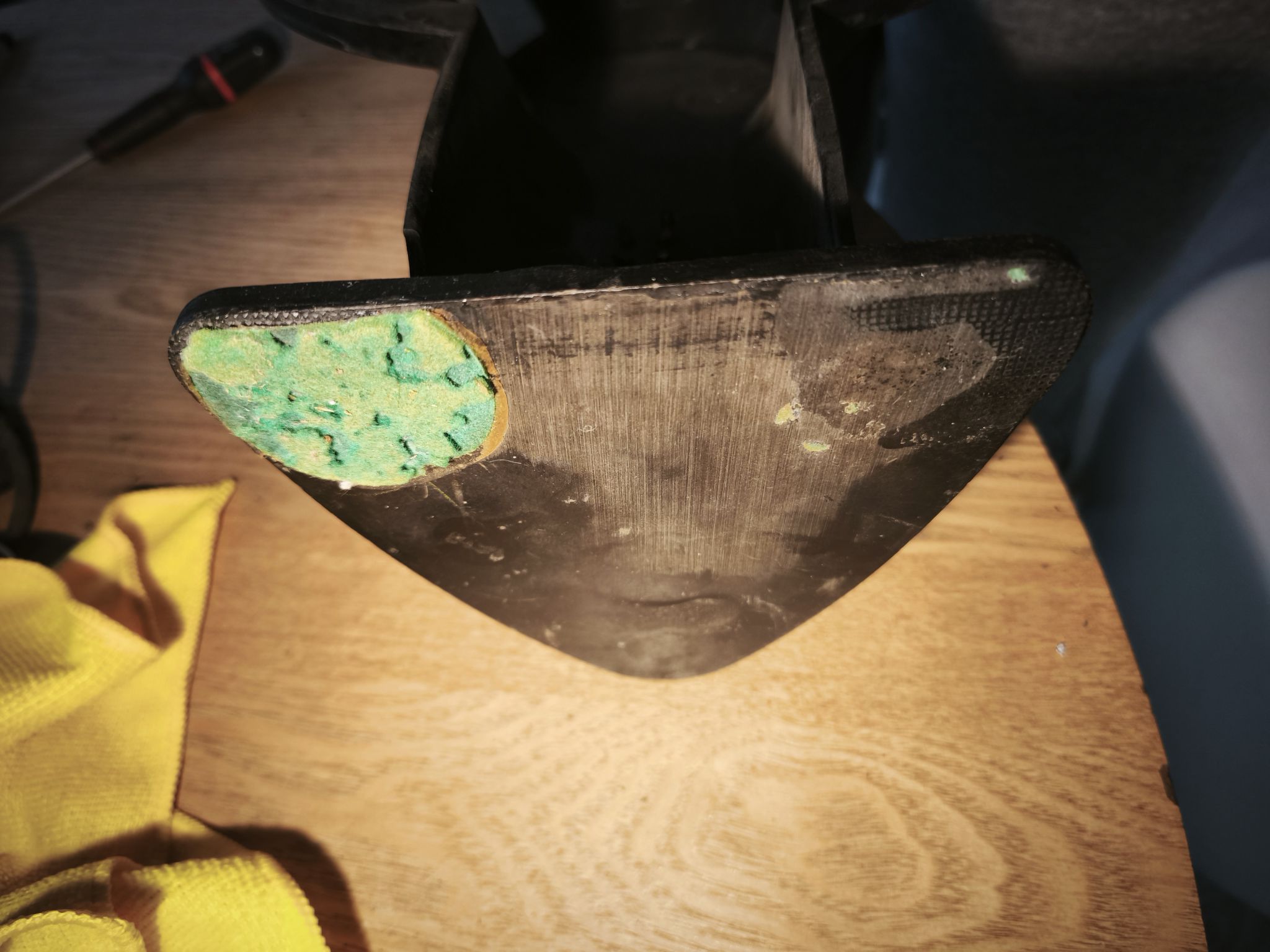 On remarque l’un des trois patins en feutre vert d’origine. Je ne les remplace pas encore car le feutre d’origine est rare (feutre de poil animal) et le feutre synthétique disponible ne me convient pas. Je patienterai jusqu’à trouver le bon feutre :