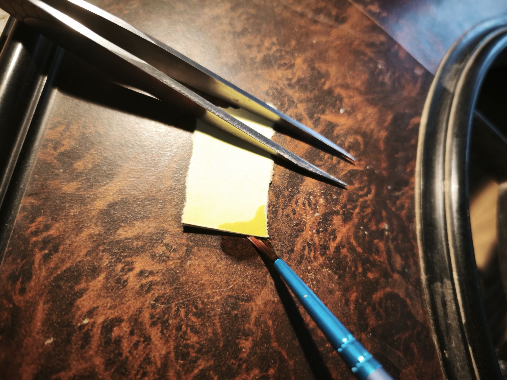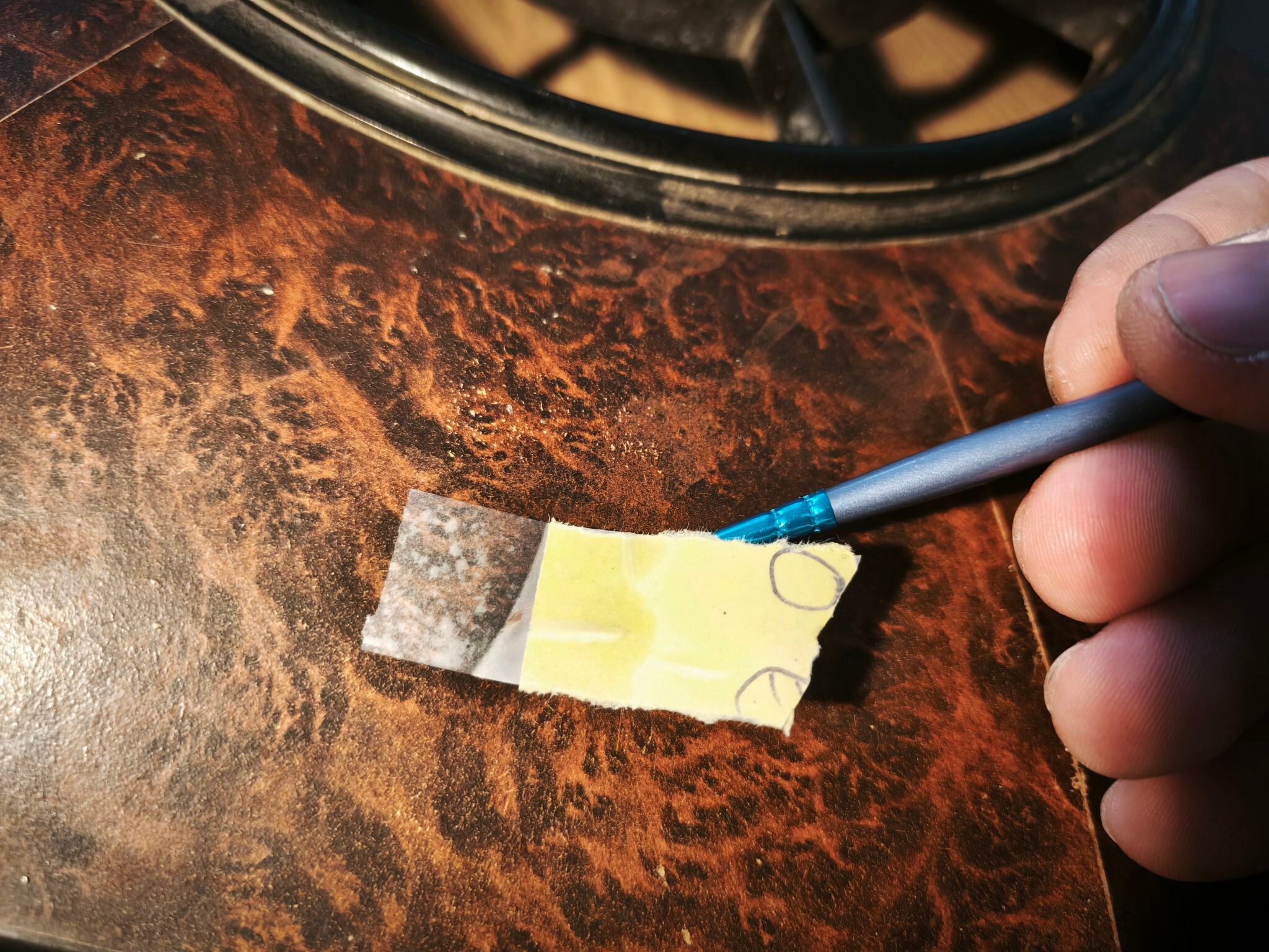 Je place un morceau de feuille de polypropylène transparent (support pour appliquer la colle), j’applique la colle avec un pinceau fin. Une fois qu’elle devient translucide, je récupère le morceau avec une pince brucelle et le place sur la déchirure (côté colle sur la membrane). Avec un second pinceau dur, je tapote doucement pour que le papier adhère parfaitement (il doit rester translucide, sinon il n’adhère pas) :