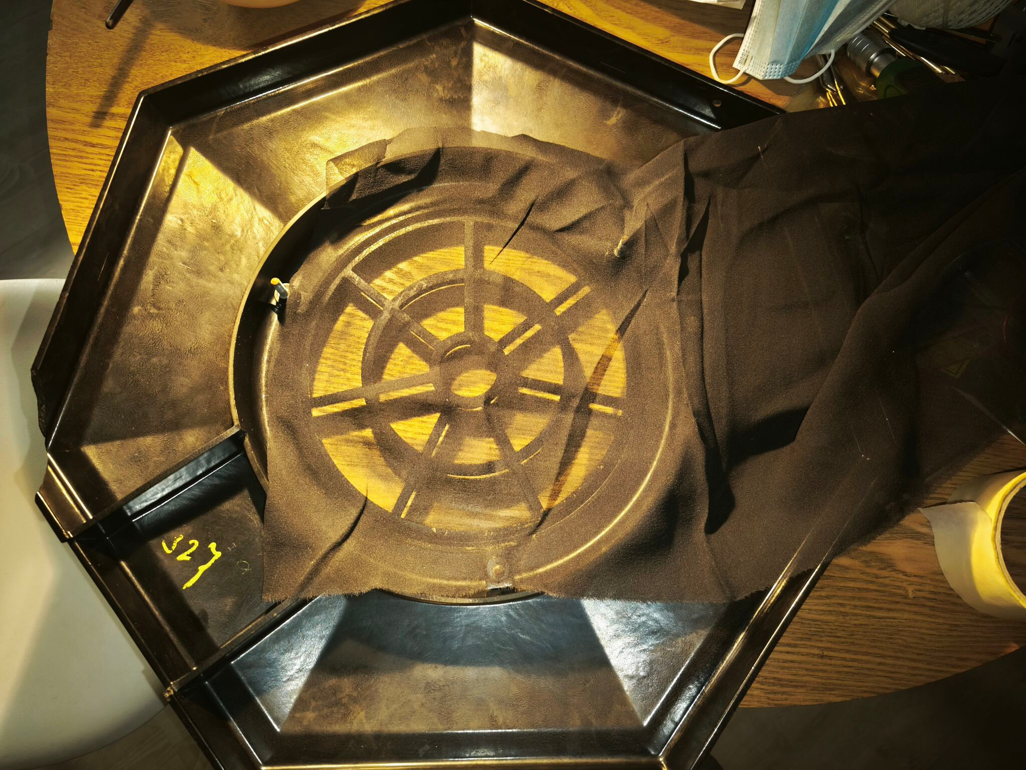 Je conserve le tissu d’origine, bien abîmé, et je le protège avec une fine toile de soie noire. La décoration reste visible par transparence.