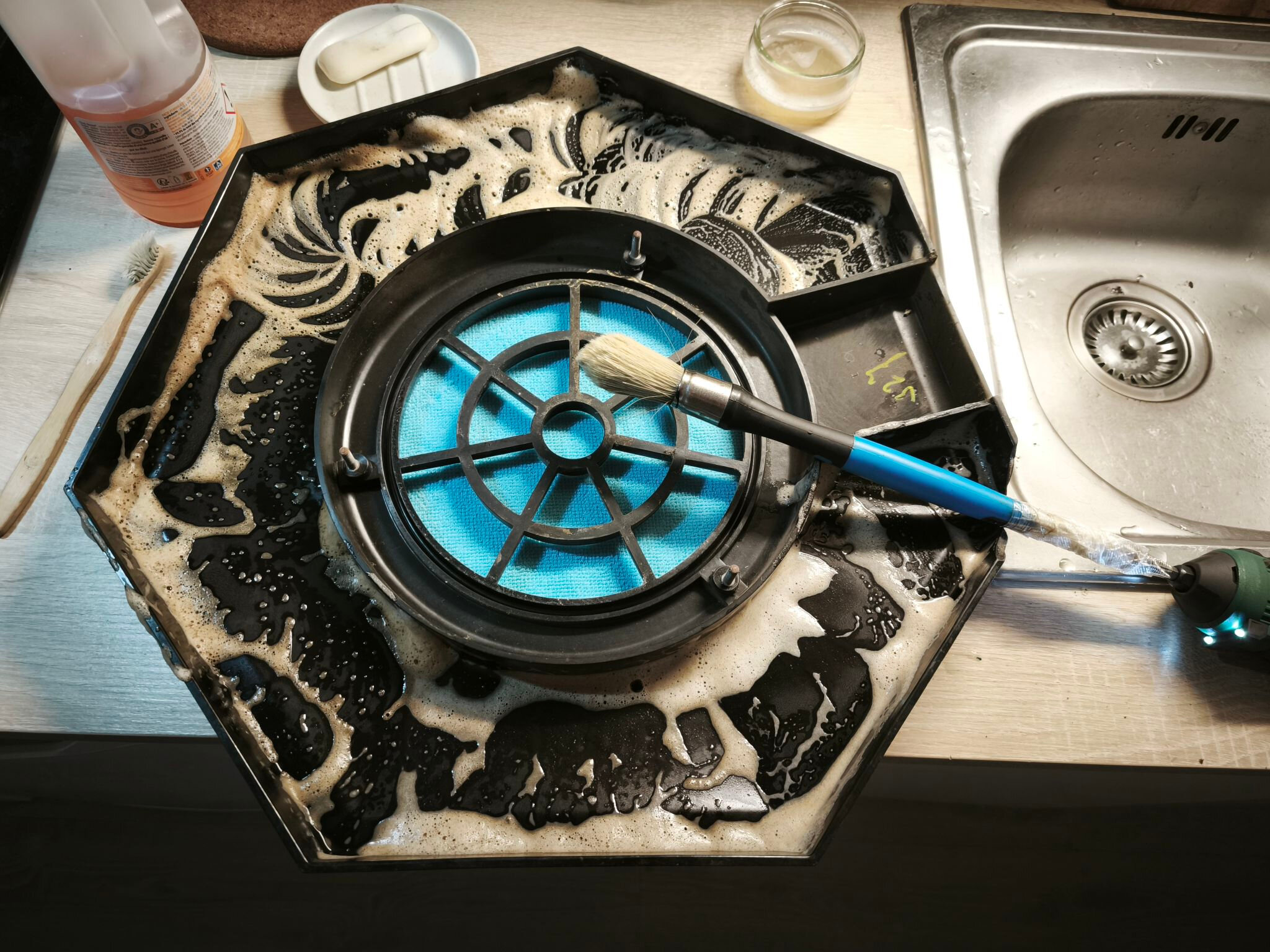 Maintenant, nettoyage de la membrane. Elle doit être propre pour que la colle adhère correctement. J’utilise de l’eau et du savon noir, mais avec parcimonie pour éviter de la déformer.
