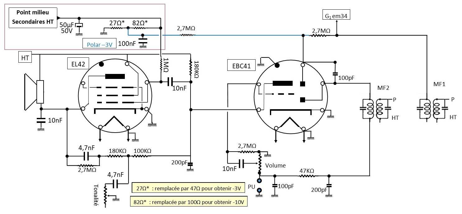 Pour ta polar, un petit complément, au niveau de la grille de l’EBC41, un découplage sur la prise -3V, ne peut pas faire de mal, et, éviter par la suite, quelques problèmes de bruit de fond et autres accrochages.
