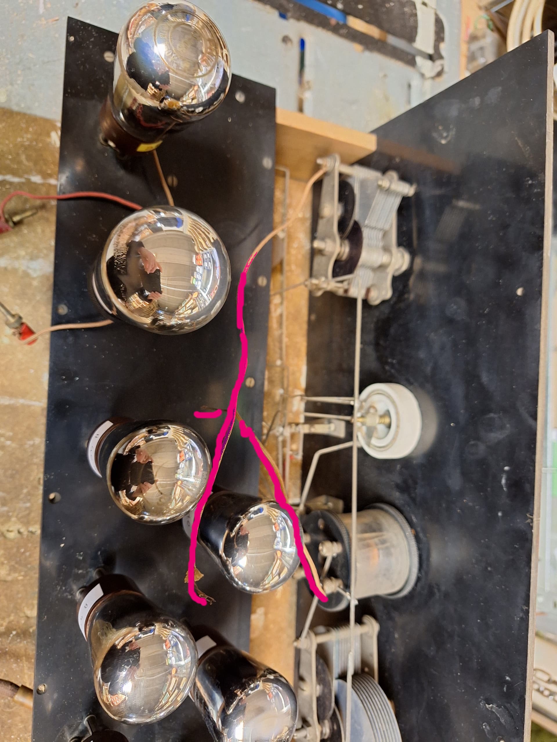 Oui, le bobinage dit « Tesla » ou « Filtre » est connecté entre la lampe bigrille et le premier ampli MF, un des transfos MF entre les lampes amplificatrices MF et l’autre entre le dernier ampli MF et la détectrice.