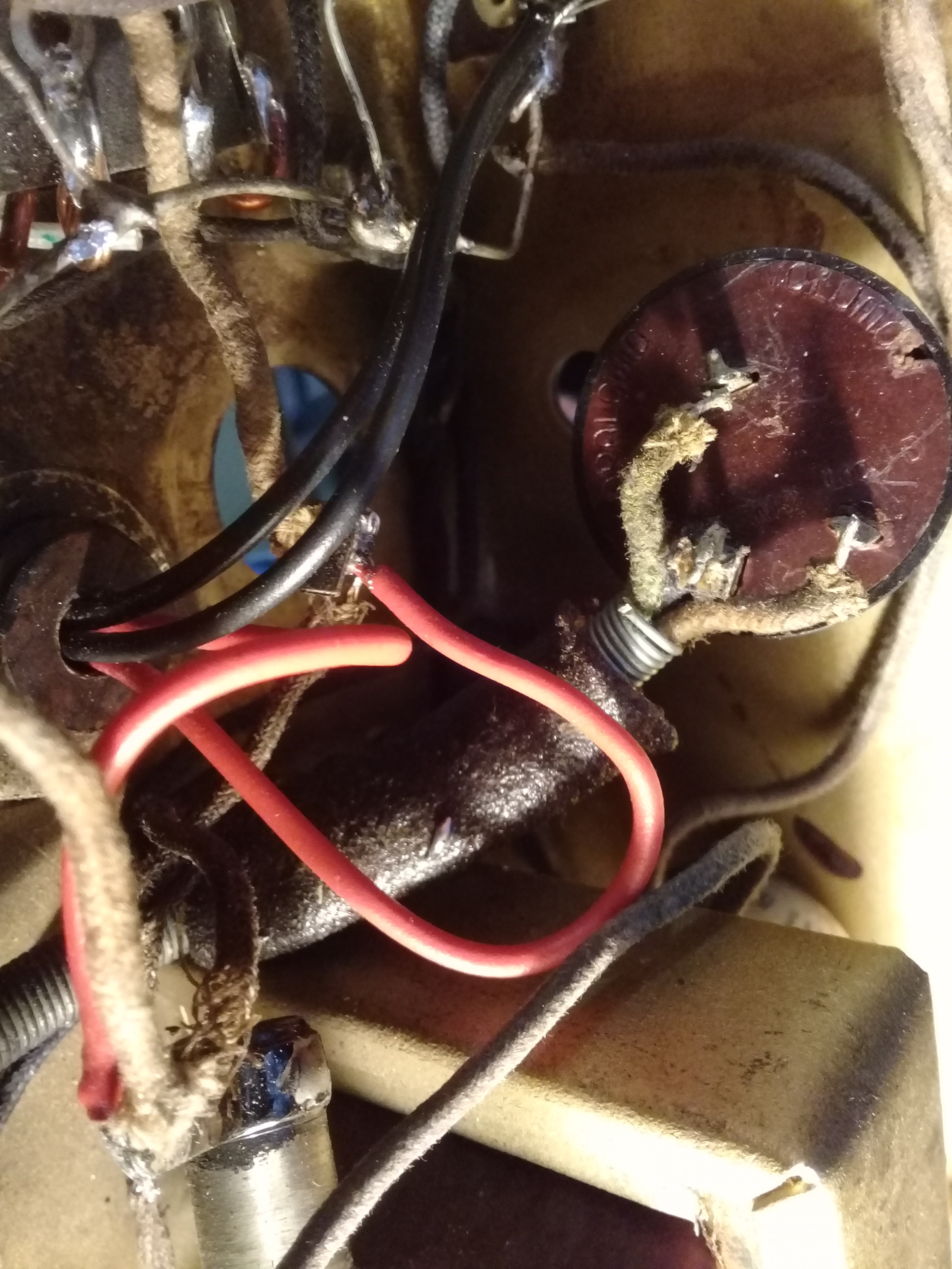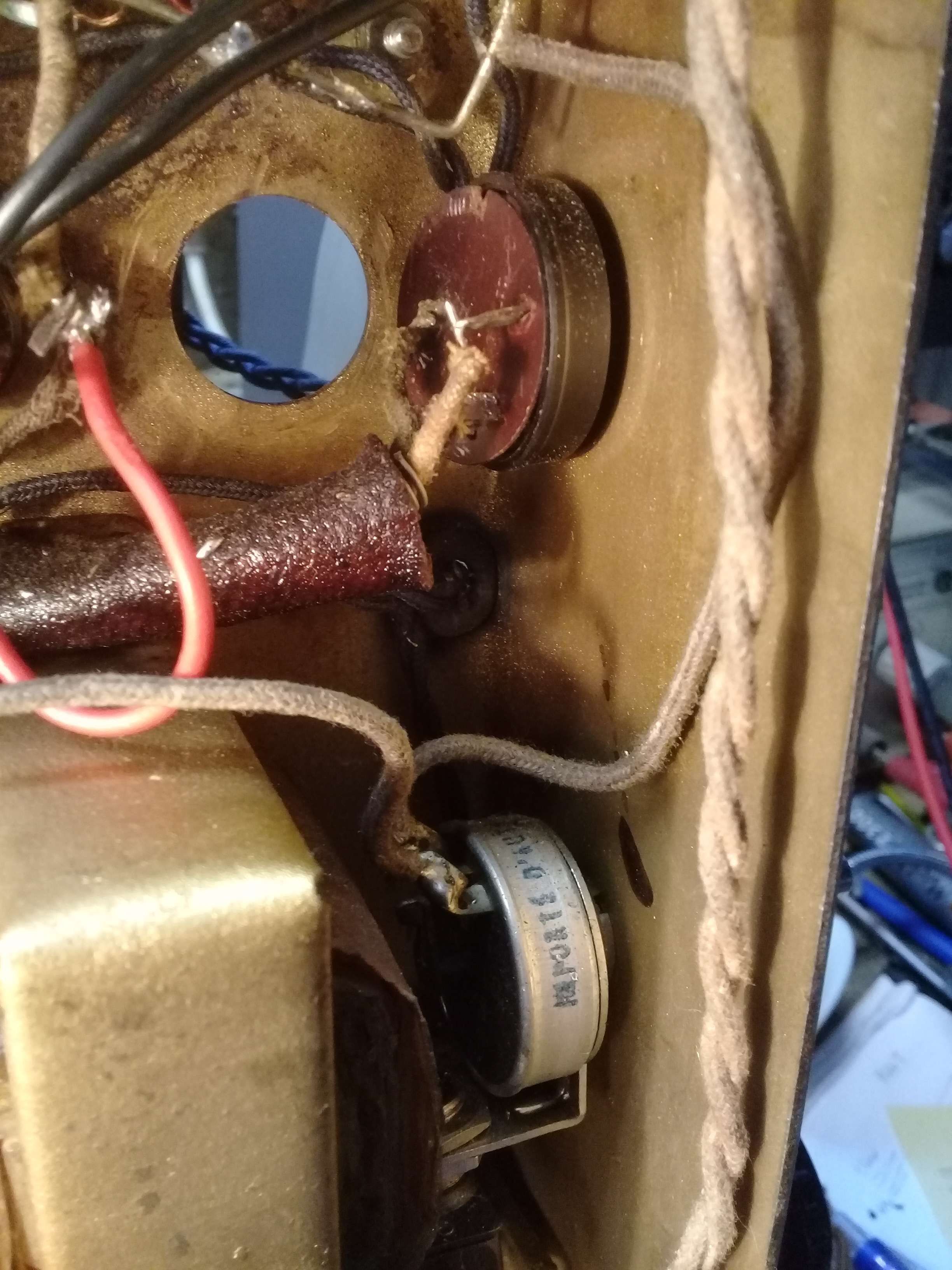 Par contre au dessus, celui du volume a morflé: l’axe a disparu et avant de disparaître il a dû plus ou moins enfoncer la piste (il n’y a un contact qu’à une extrémité). C’est un 500Mohm Log. Je vais voir si j’ai ça.