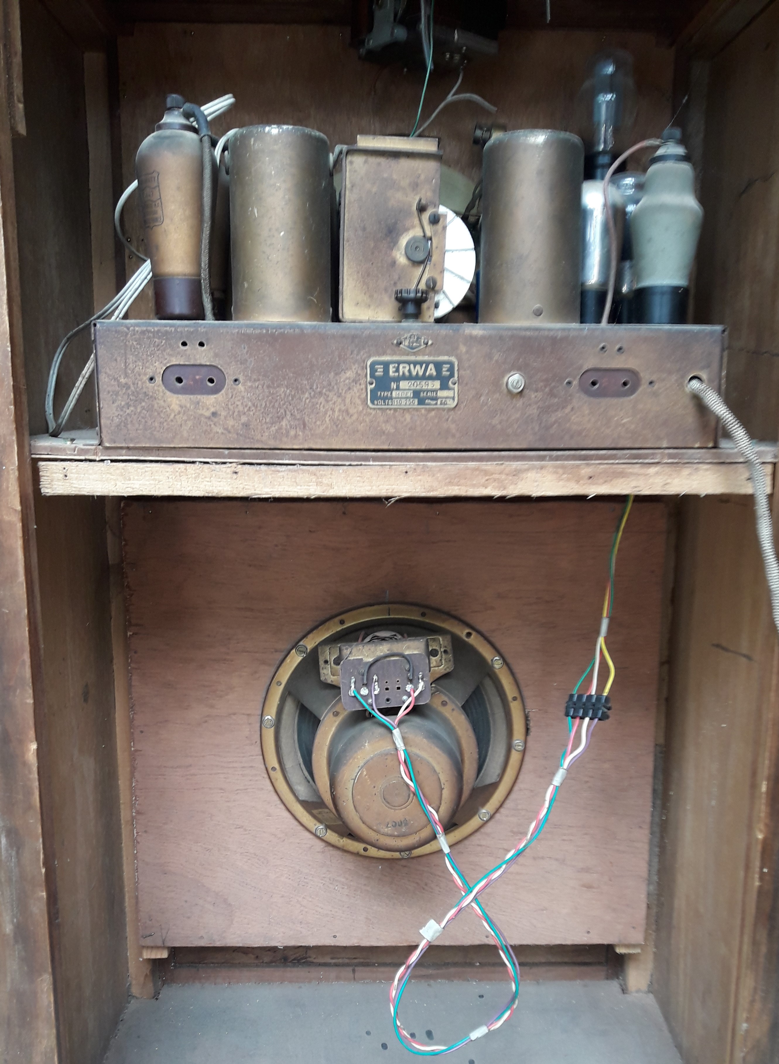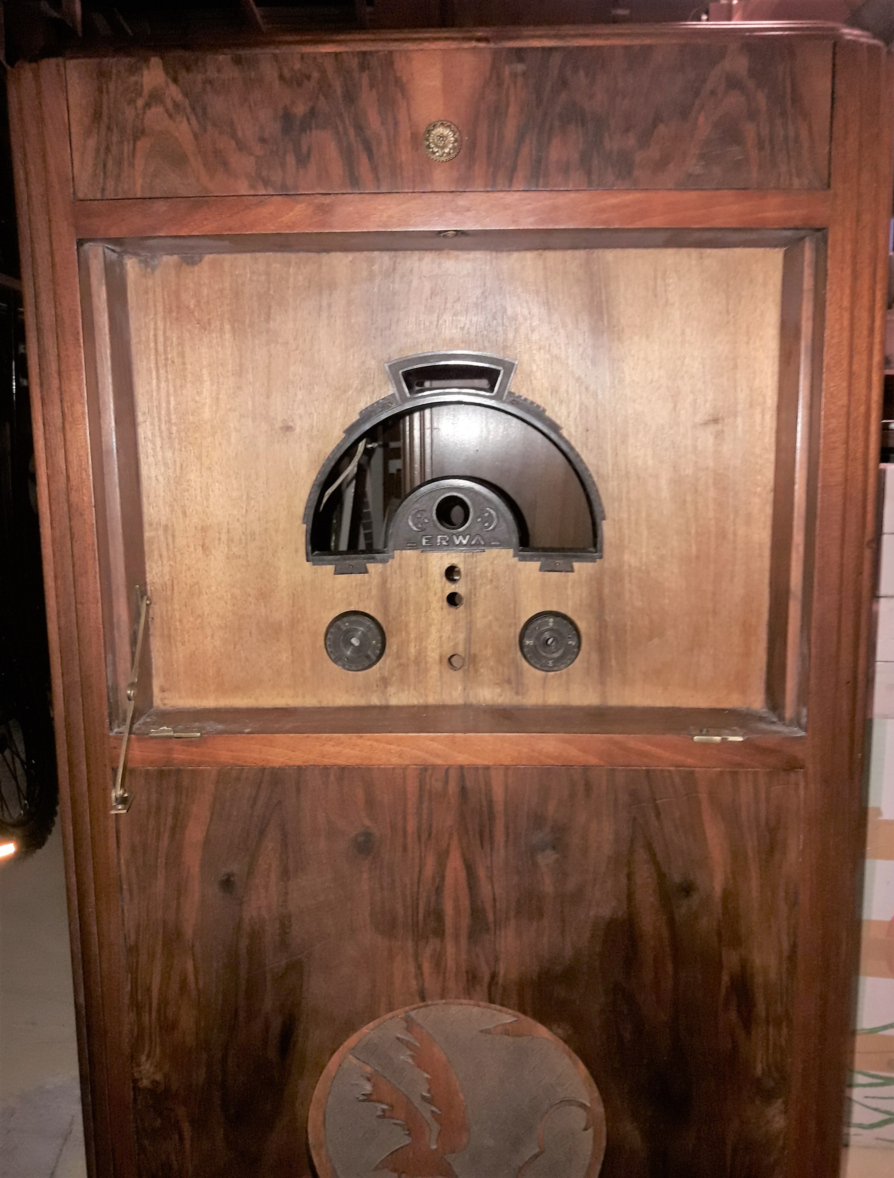 bon , je pense que se mr coste de niort savait, plutôt que de me dire qu’il avait vu un meuble ressemblant sur le GL .il est collectionneur depuis longtemps et apparemment fréquente radiofil. tant pis pour moi, mais le meuble est très beau, je vais faire un faut en reproduisant le sigle erwa puisque j,ai les traces sur le tissus , mettre un cable hp d’époque avec une prise 4 plots sur le coté du chassis. mais faut le dire a personne!!.
