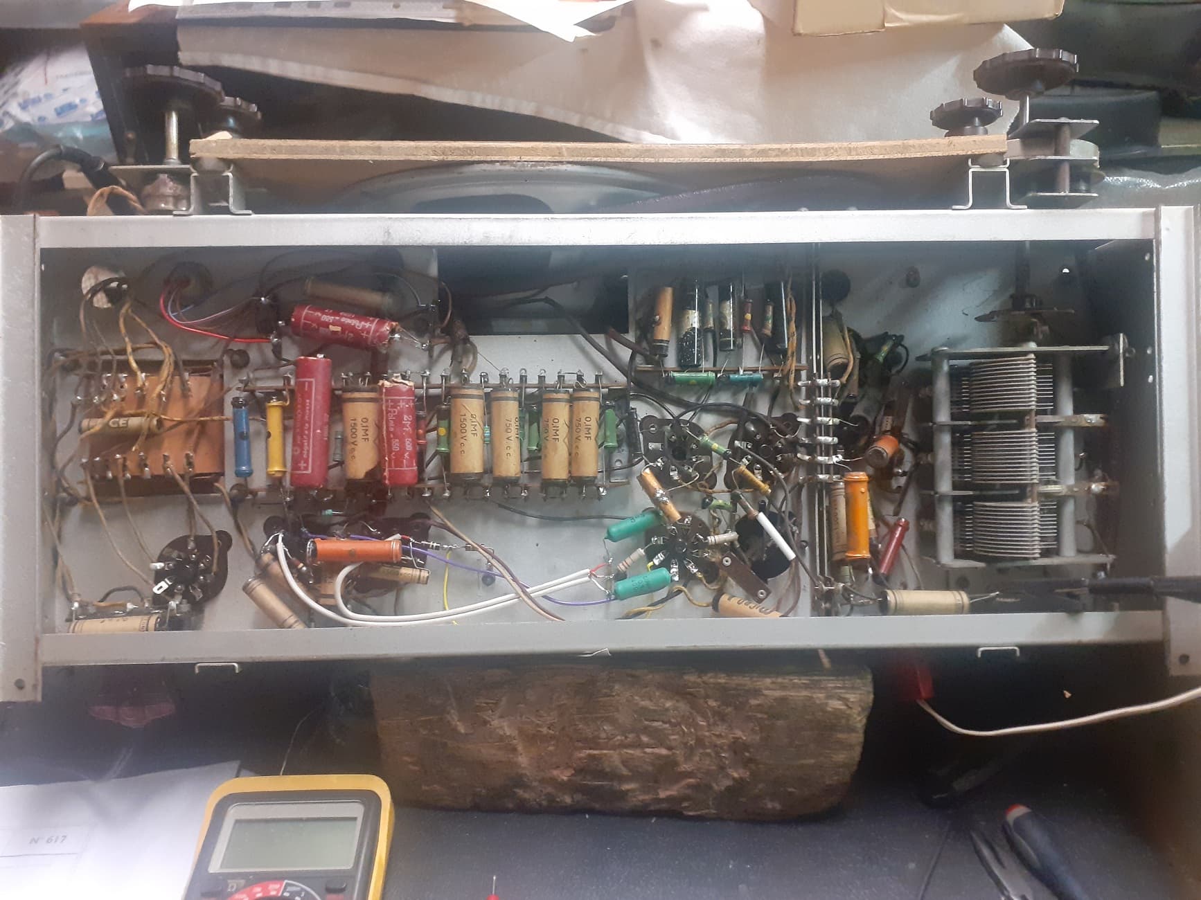 J’ai attendu le soir pour quelques essais. Les tensions sorties HT sont correctes. J’alimente depuis le poste en 110 V. Tout va bien, souffle important en GO, quelques stations en PO, mais surtout signaux forts et nets sur OC et OTC avec une antenne de 4 m, posée horizontalement au garage.