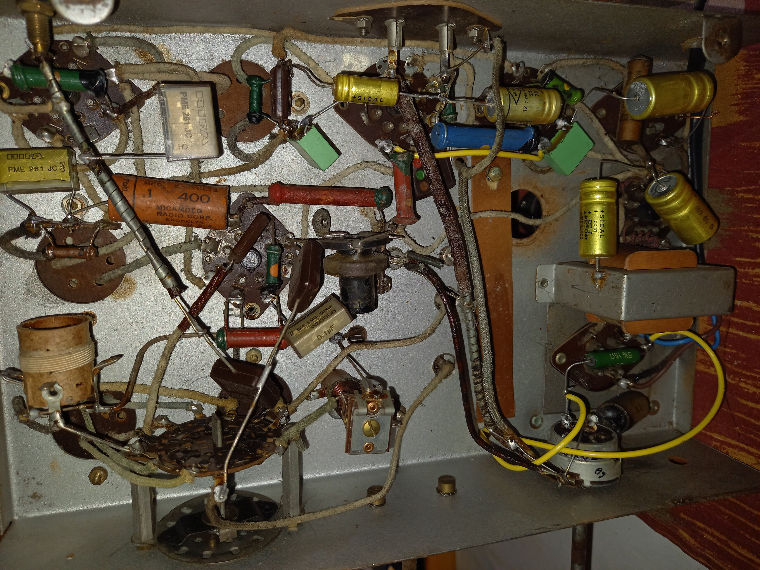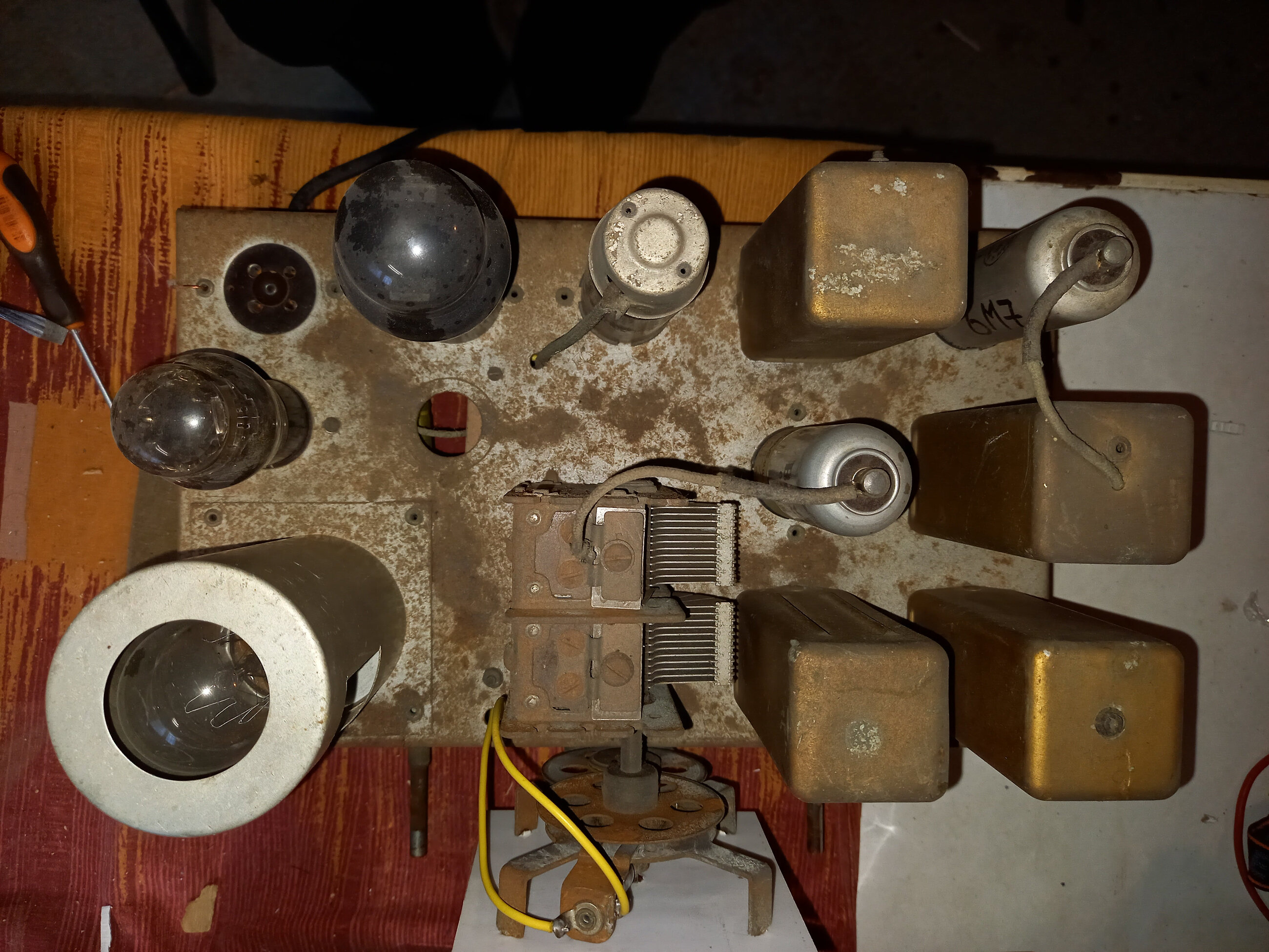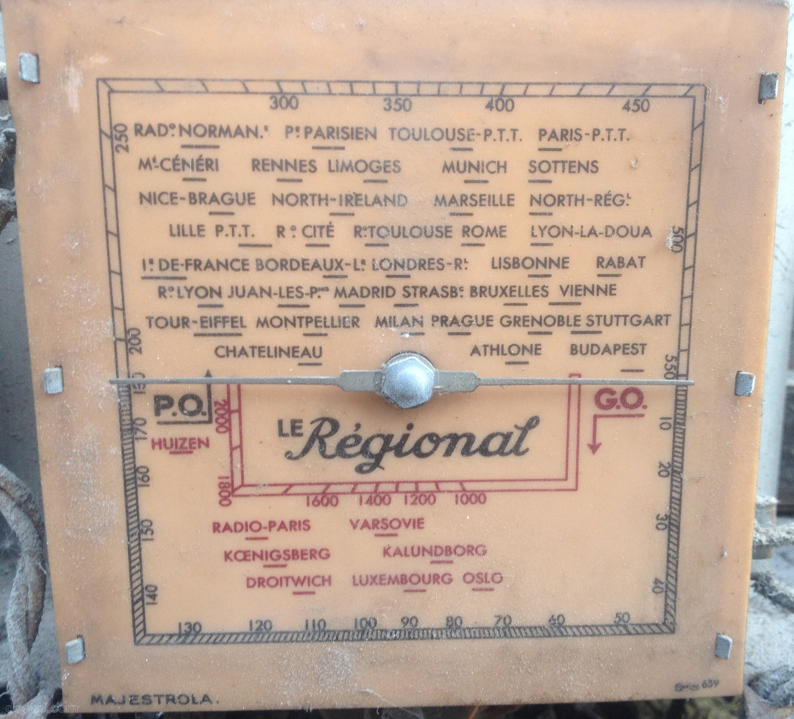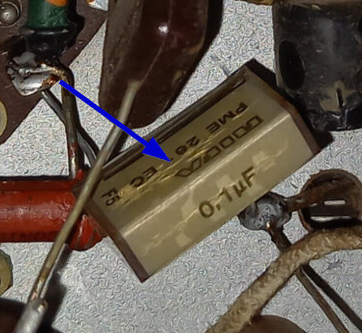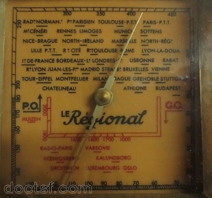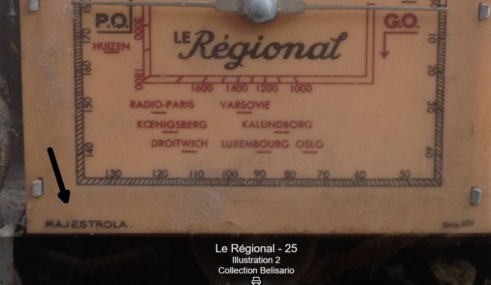 (Et j’ajouterais même que c’est un châssis de poste “alternatif” réutilisé en poste “tous courants” , et que le cadran effectivement marqué “le régional” et provenant probablement d’un “régional 25” ou “régional super 35” n’est initialement pas fait pour aller avec cette caisse et cet enjoliveur, même remarque pour le haut-parleur à aimant permanent pas d’origine et pas fixé droit qui n’est pas plausible pour une fabrication sérieuse, les postes verticaux de ce genre et de cette époque avais un H.P à excitation …Ce qui confirmerais la reconstruction a partir de deux postes différents !)
