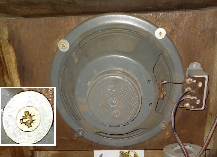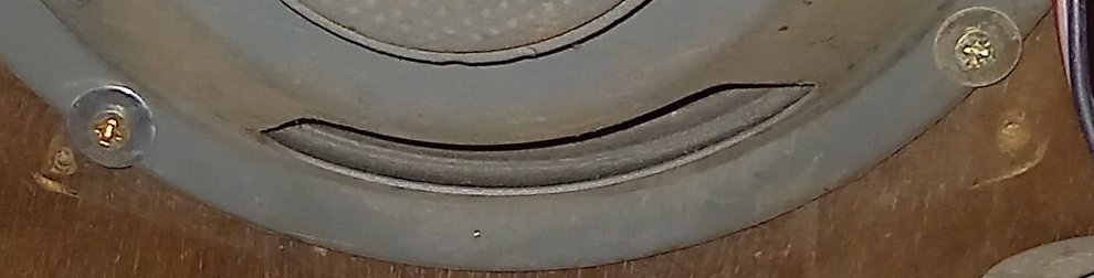 Ce H.P à aimant permanent n’est pas de l’époque du poste (il est plutôt des années 1950 ) on devine d’anciens trous de vis de H.P (avec un entraxe différent) et enfin, aucun constructeur sérieux n’aurais fixé ce H.P de traviole …