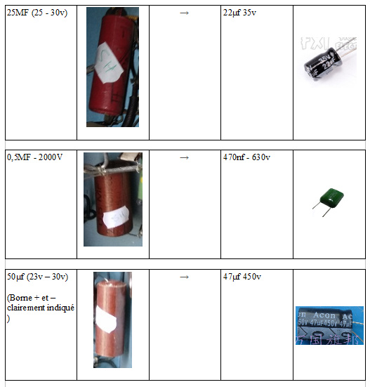 Idem pour ces condos (on voit également une borne + et -), Par quel type de condo moderne devrais-je le remplacer ? ( Chimique ?, plastique ?, chimique polarisé ?, … )