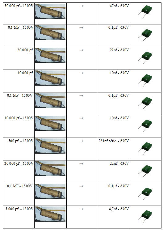 Pour les condensateurs, j’aimerais tous les remplacer ! les condo’ de filtrages ont fuient et je suis sûr qu’ils sont secs ! Pour les condensateurs non polarisés, la plupart sont secs et cassés ! (Sauf peut-être ceux au mica, moulé dans de la cire, ils ont l’air intact et ont visiblement une bonne tenue dans le temps … à me confirmer