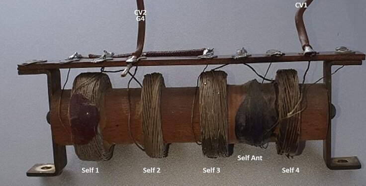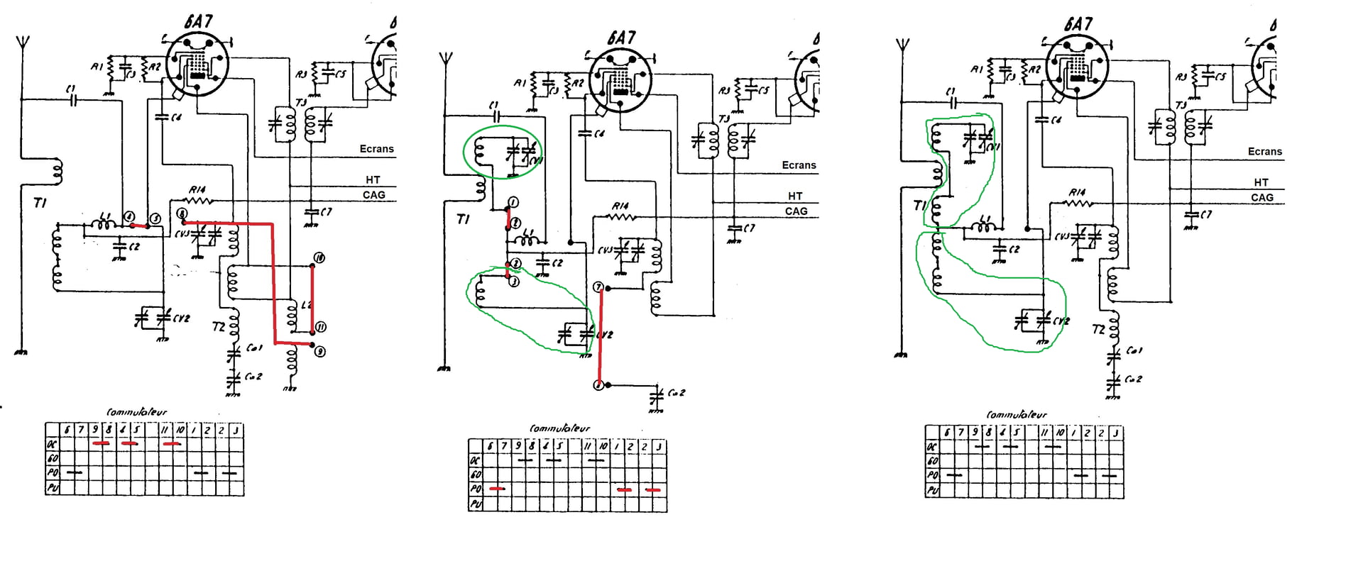 Pour voir, juste pour voir ce que ça donne, au lieu de mettre le doigt sur le têton (de la 6A7, bien sûr ),essaies de monter une capa, de faible valeur, 22 pF maxi, entre CV1, et, CV2. Si tu n’as pas cette valeur, tu soude sur chacune des cosses supérieures des cages CV1 et CV2,un fil rigide isolé, (du fil cuivre verni de transfo, pas trop fort en diamètre )d’une longueur de 10/15 cm, que tu torsade assez serré, sur une (pour commencer)longueur de 5 cm. Peut-être, y aura-t-il une amélioration. Tu peux, ensuite ,torsader davantage, ou détorsader, pour voir si ça change quelque chose. Essai, à faire, en PO ou GO, car, en OC, je ne sais pas ce que ça fera ! A essayer aussi, de toutes façons, c’est sans risques !!