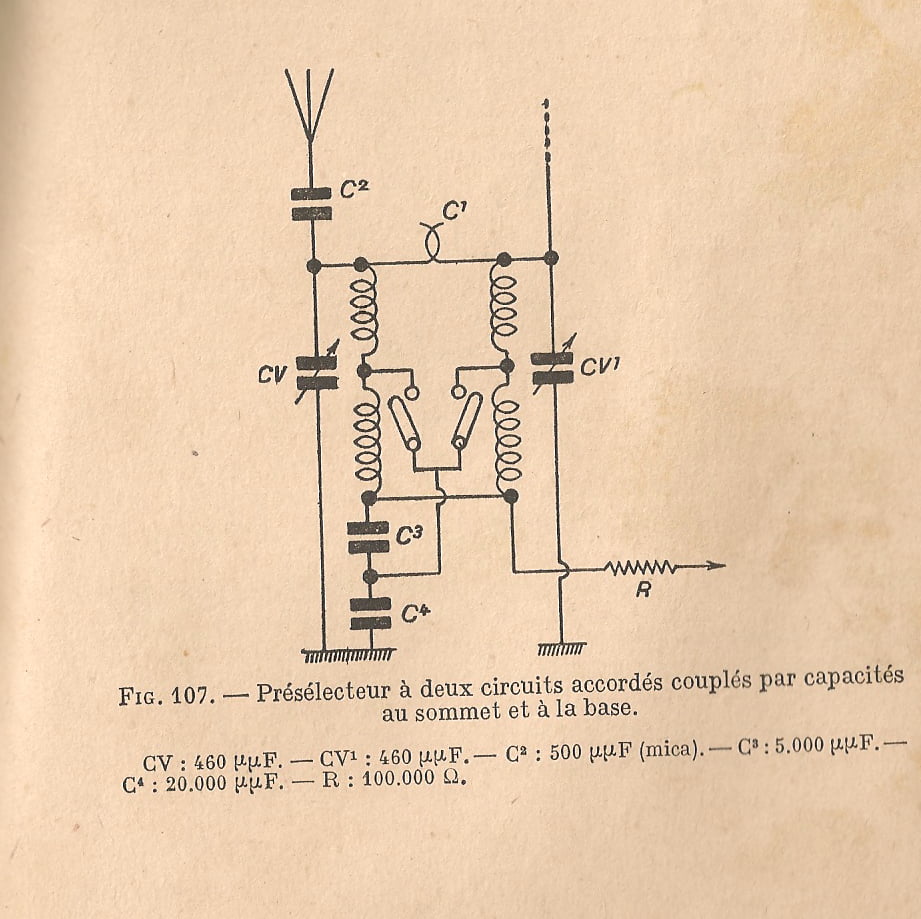 la capa de 2nF ( vaut mieux un 600V ) en série avec la bobinage antenne est là tout simplement pour éviter de cramer la bobine antenne en se servant d’un fil secteur comme antenne ( pratique courante à cette époque)