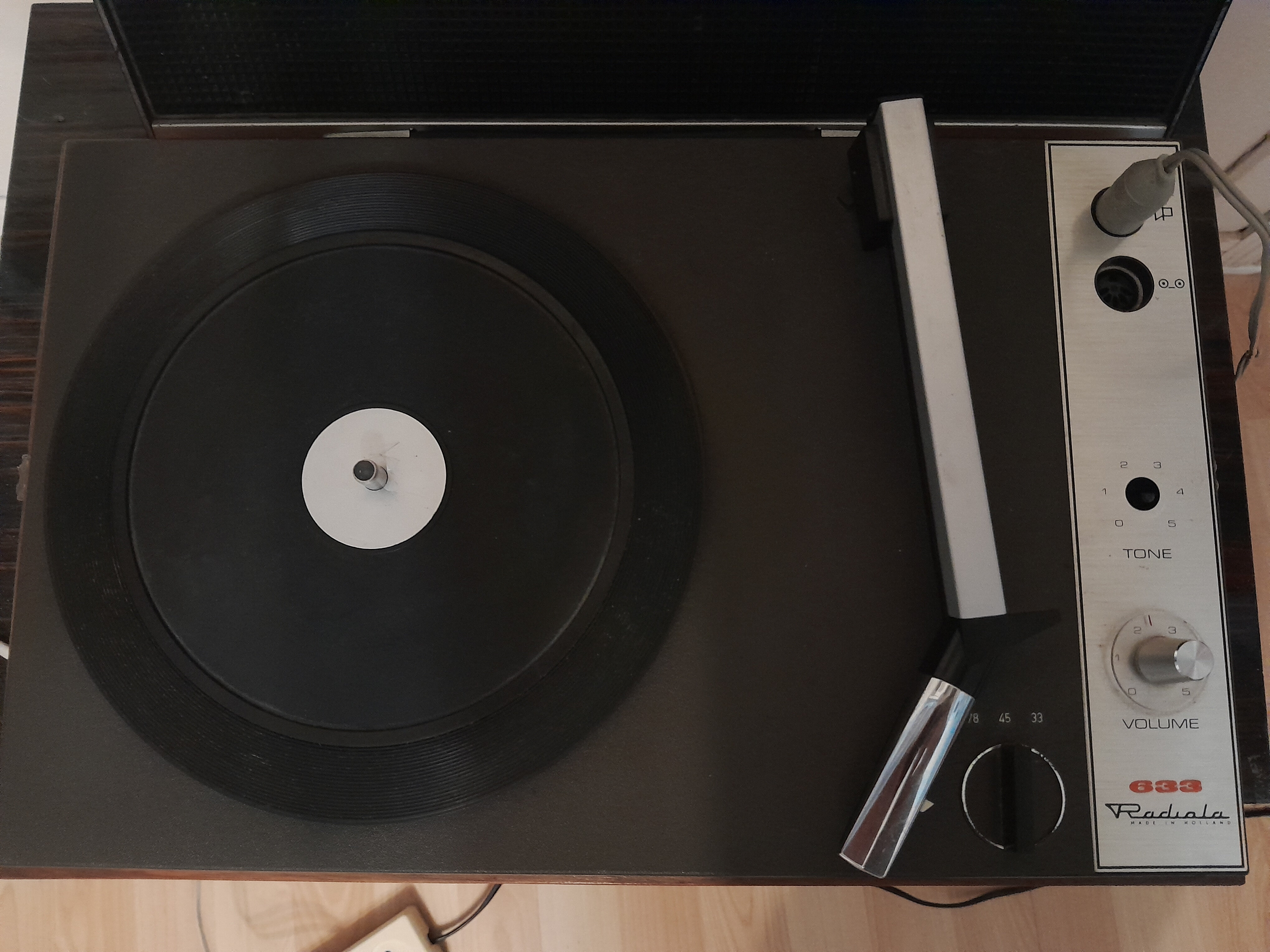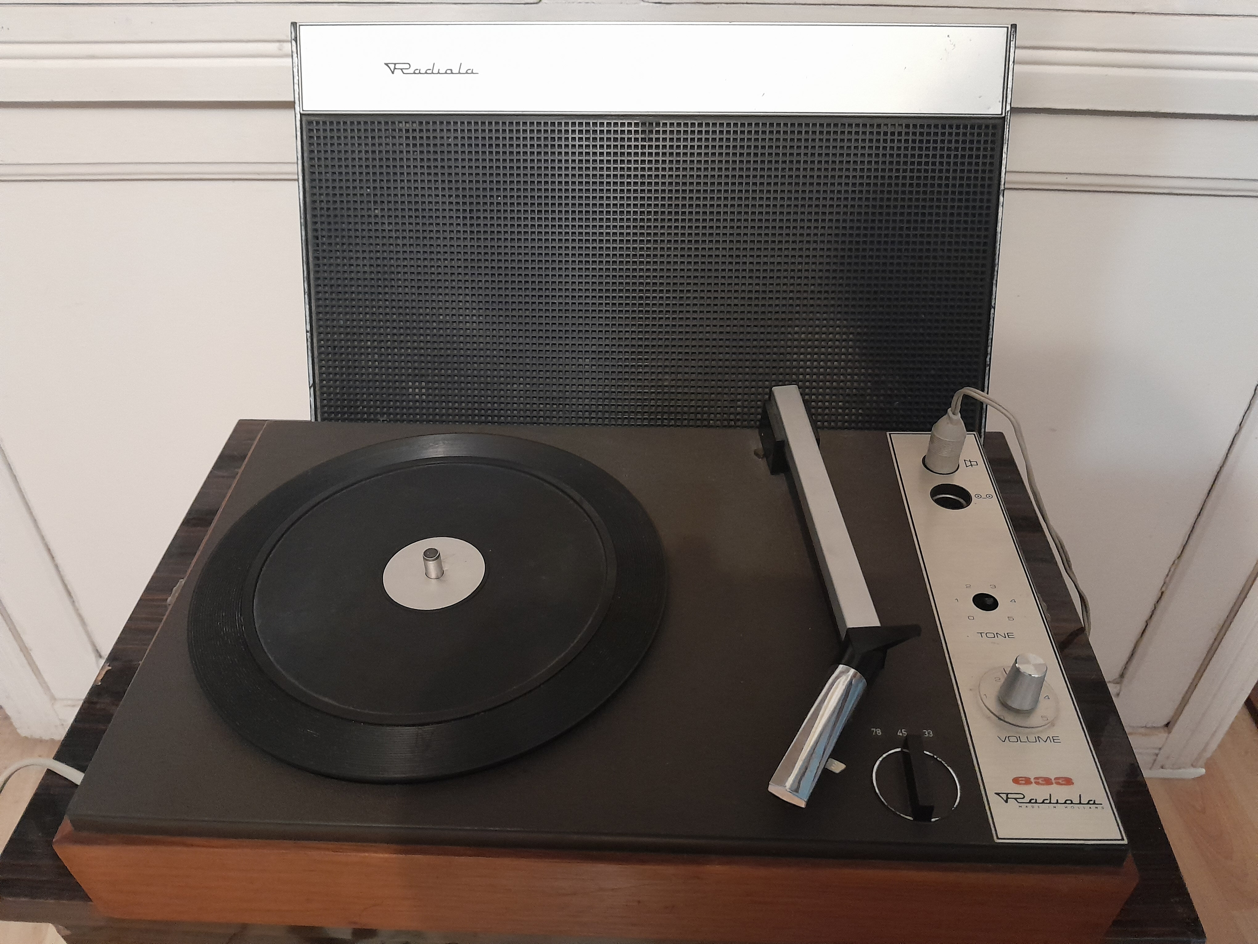 j’ai trouvé samedi dernier dans un vide maison pour 10 euros se charmant électrophone Radiola 633 (Phillips), c’est un modèle d’une gamme que je rêvais d’avoir depuis longtemps car je trouve très joli le design du bras et de la tête.