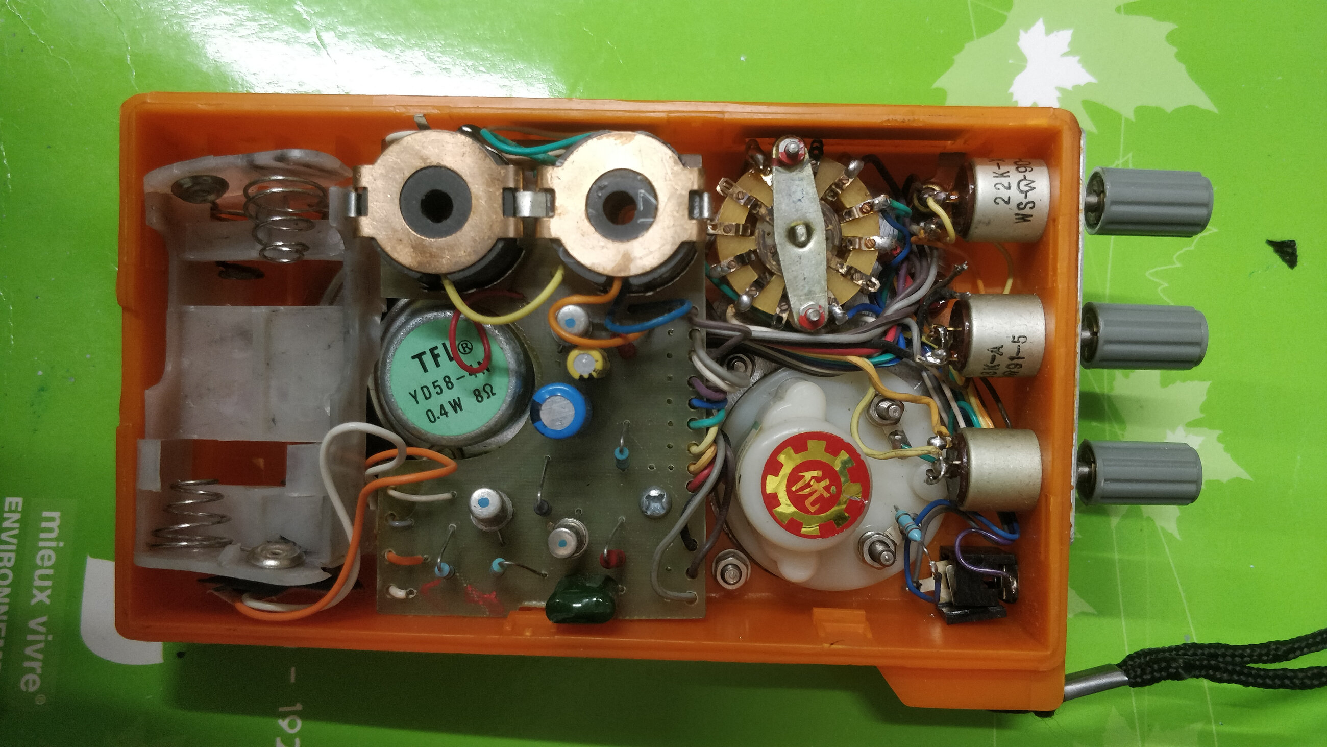 J’ai dû remplacer le haut parleur car celui d’origine était terriblement nasillard (dû à l’usure sans doute) et l’aimant permanent foutais le camp, j’ai du remplacer aussi la résistance variable de réglage de la vitesse du moteur qui est tombé en morceaux quand je l’ai manipulé pour réajuster la vitesse (pourtant j’y suis allé avec une extrême délicatesse… c’est visiblement fragile ces petites choses là ).