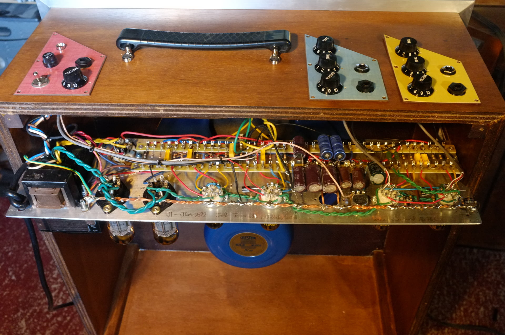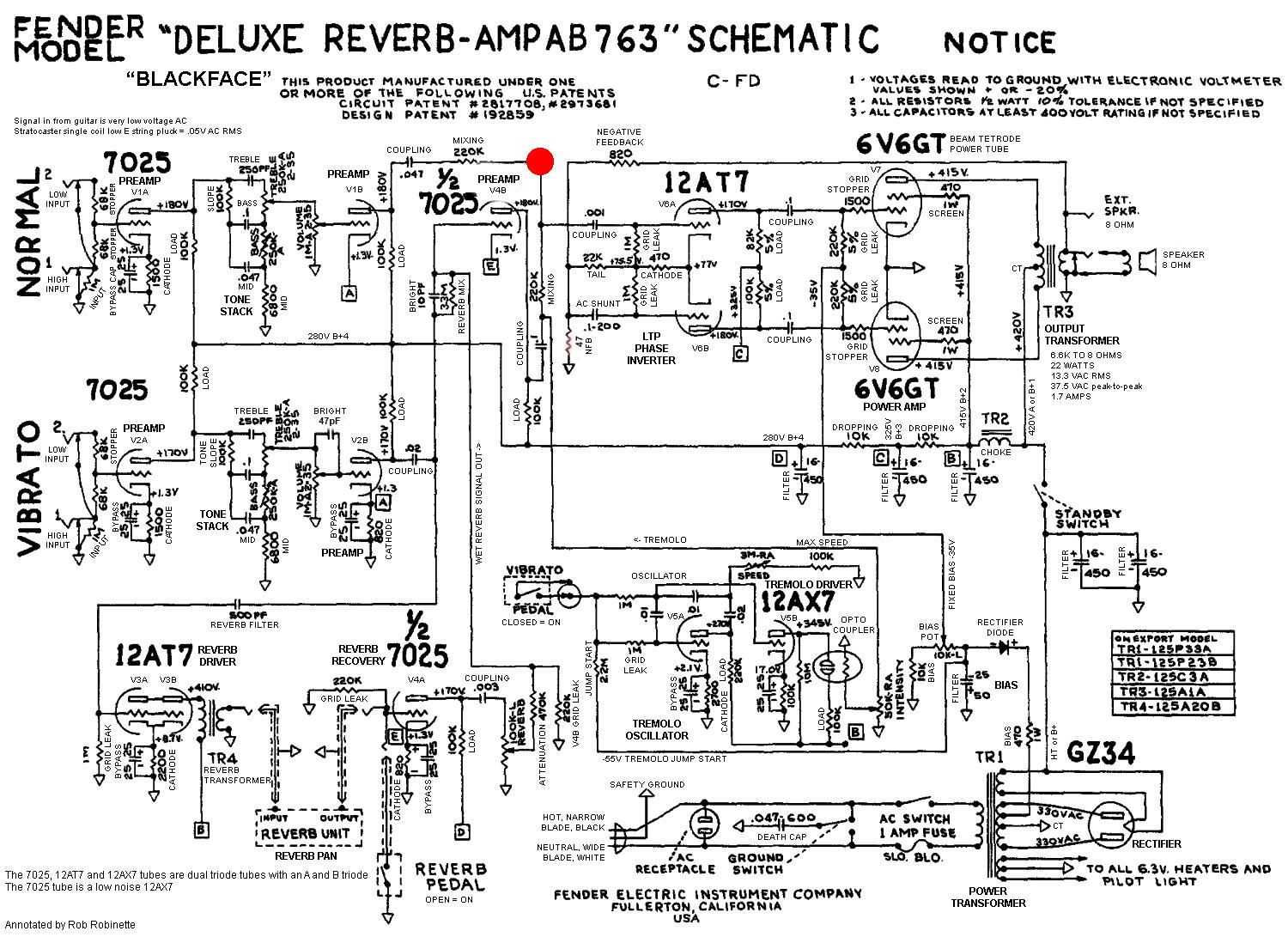 Je viens de terminer la fabrication d’un ampli guitare pour un copain. Je me suis basé sur un schéma de Fender Deluxe Reverb AB763 dont je n’ai gardé que l’alim, le déphasage et l’étage de puissance. J’ai remanié les étages d’entrée pour avoir deux voies identiques et j’ai enlevé tous les circuits de vibrato et de reverb.