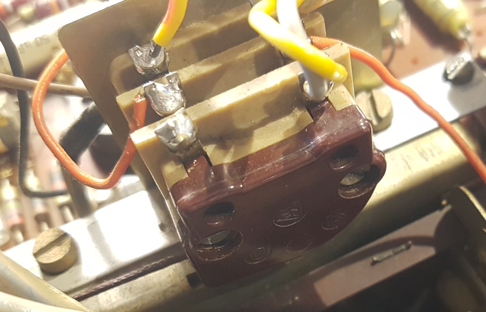 Avec toutes ses lampes le poste fonctionne en AM et FM mais la tension HT baisse assez fortement. Je n’insiste pas et je remplace le redresseur sélénium par une diode 1N4007 et une résistance en série. Après plusieurs essais, 100 Ohms me donnent une tension HT qui correspond aux valeurs du schéma.