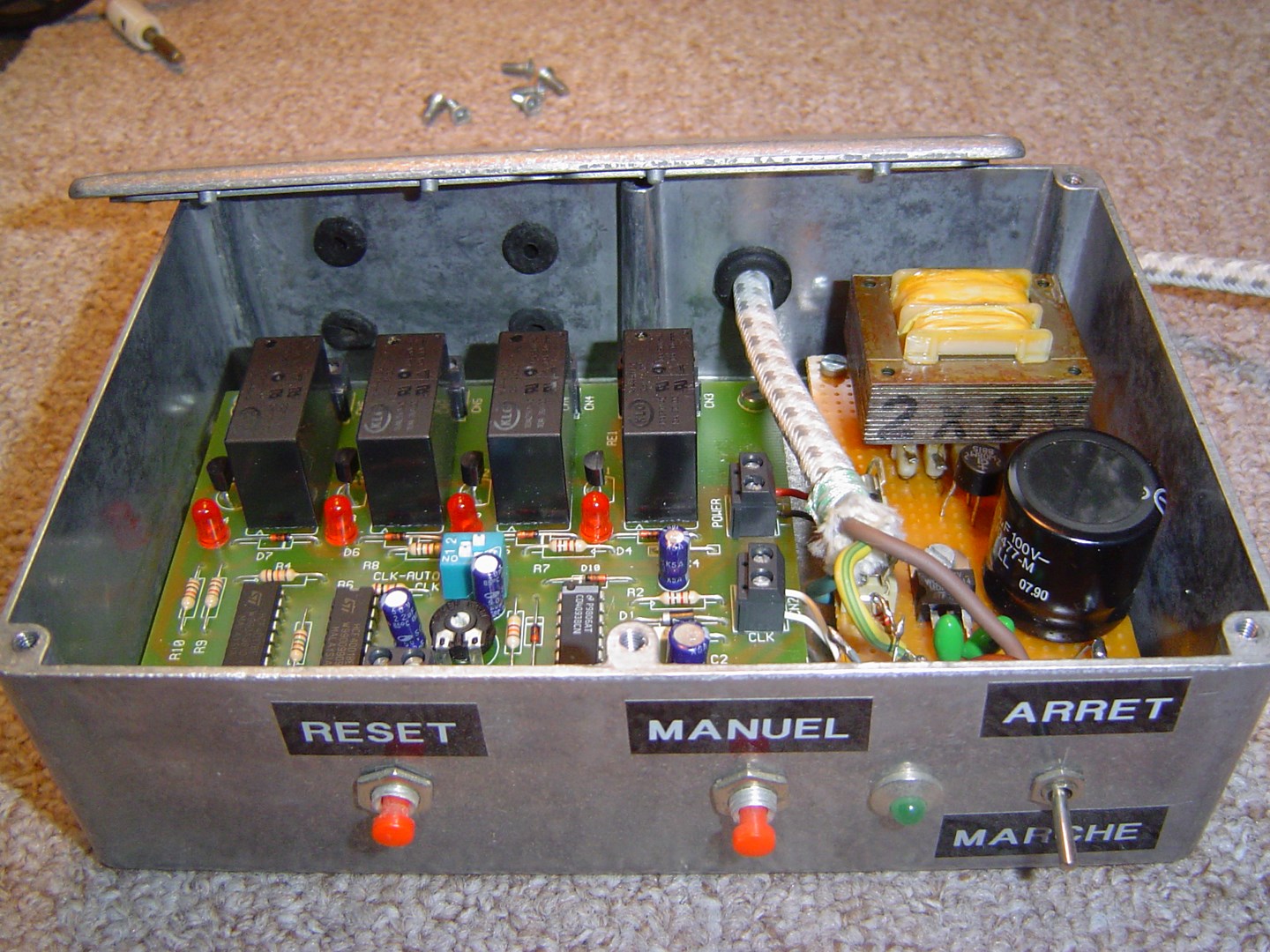 A vendre ce petit montage en coffret métallique de 170x120x50 mm avec couvercle.Les 4 voies sont indépendantes et commutent un relais avec chacun un contact repos/travail qui peuvent commander n’importe quoi.La visualisation s’effectue par diodes LED rouge, et la tempo est réglable de 0.3 à 10 secondes environ.Le fonctionnement est soit manuel, soit automatique.Alimentation 230 v incorporée.Livré avec mode d’emploi.