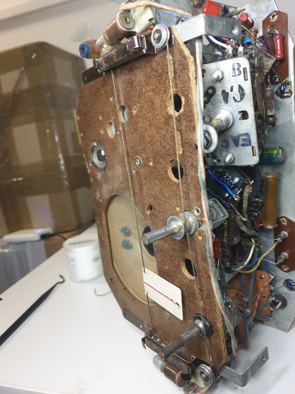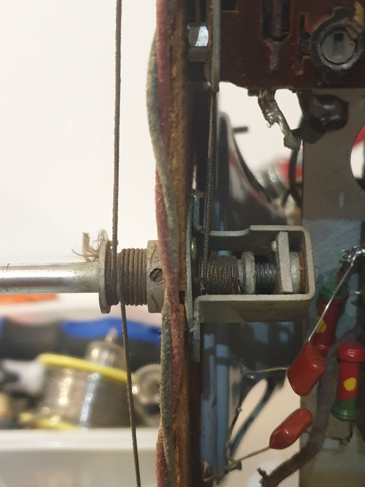 Il y a effectivement 2 ficelles distinctes pour ce poste une pour l’aiguille et l’autre pour commander le CV ,il faut calculer le rapport entre le diamètre de la poulie CV et l’axe d’entraînement, positionner le CV d’un coté à fond accrocher la ficelle sur la poulie , enrouler le nombre de tours sur l’axe de commande suivant le rapport passer la ficelle par le trou en comptant un tour de plus et rejoindre la poulie avec le ressort !