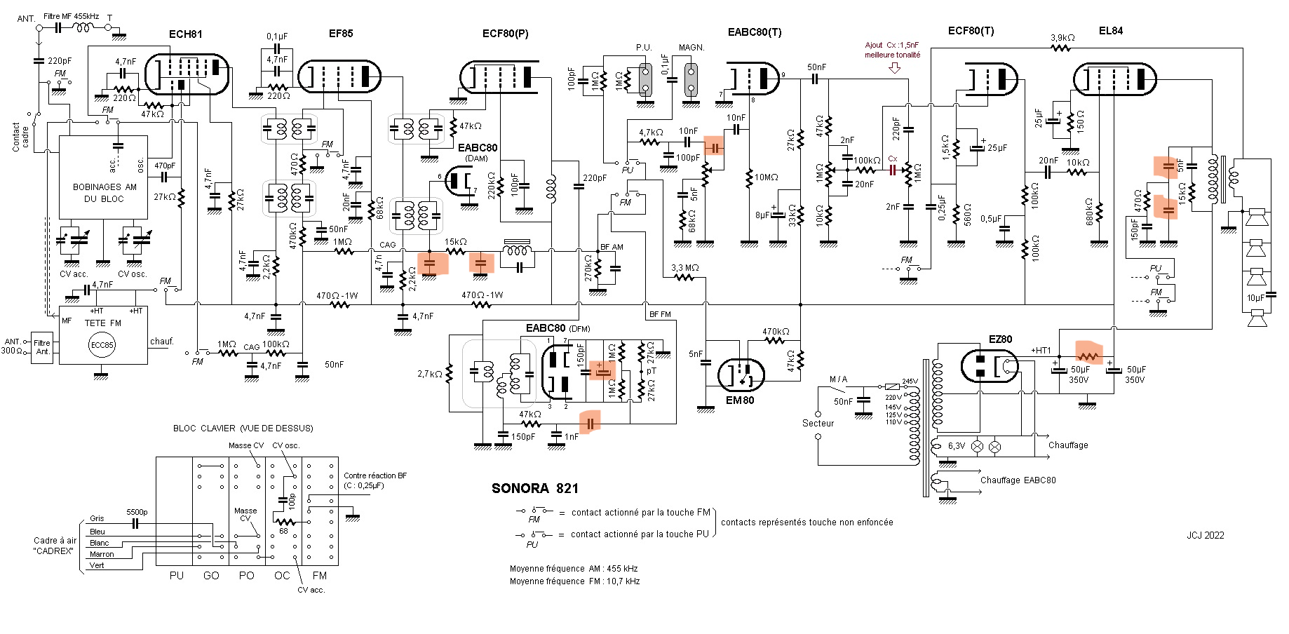 malgré ce plan, j’ai du mal à mi retrouver. Je pense que la lampe du haut est EZ80, celle du bas à droite, EL84, et en bas à gauche ECF80. Dans mon petit stock de lampes, j’ai une EZ80 et une EL84 pas de ECF80, mais j’ai une 6AK8. Sur le plan du SONRA 821, des valeurs de condensateurs et de résistances son manquantes. Quelque a t’il le plan original ou connaissez vous ces valeurs. En photo le plan incomplet.