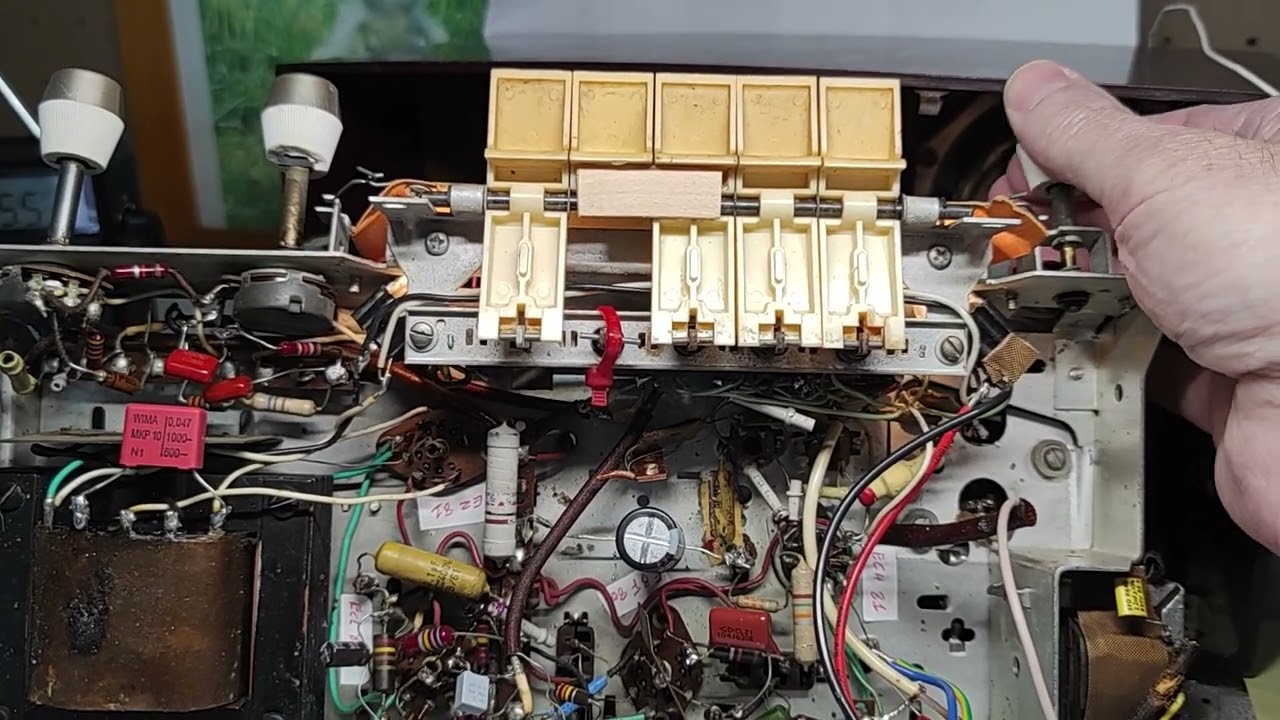 Les branchements sont non pas au dessus mais en dessous pour l’antenne , la masse et tous les branchements se font en dessous avec les 7 petites plaques à souder , la capa ne sert à rien , c’est la mise à la masse pour commuter le CV et B3 ne sert à rien aussi et de neutraliser la cathode de la triode heptode pour ne plus avoir l’AM , le gros fil jaune vert à remplacer par un fil blindé BF