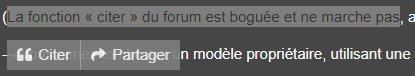 La fonction « citer » ne fonctionne plus : quand on passe la souris sur le texte a citer , puis qu’on clique sur « citer » , ça n’insère pas de citation , mais ça bugge ! ça fait n’importe quoi , sans autre solution que taper manuellement la citation a insérer …