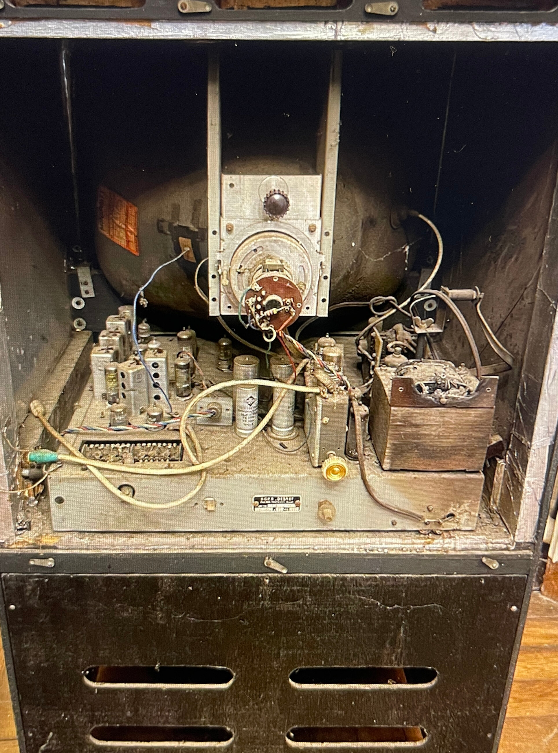 Coté électronique, le tube cathodique est excellent, un peu plus de 400 micro-ampères, la THT, pour l’instant, j’en sais rien, pourquoi serait-elle HS ??? Cependant, coté alimentation, c’est la cata…Le transfo bien sûr est HS, et l’environnement dessous c’est pas mieux, même le cache arrière a brulé. J’ai un transfo de puissance identique, issu d’un Océanic, mais différent au niveau des secondaires. Le Desmet à une HT redressée par 2 x PY82, et le transfo que j’ai, c’est un enroulement unique suivi d’un pont de diode. Coté filaments, le Desmet a un montage série (2 boucles) et l’Océanic n’a qu’un seul gros enroulement 6,3v.