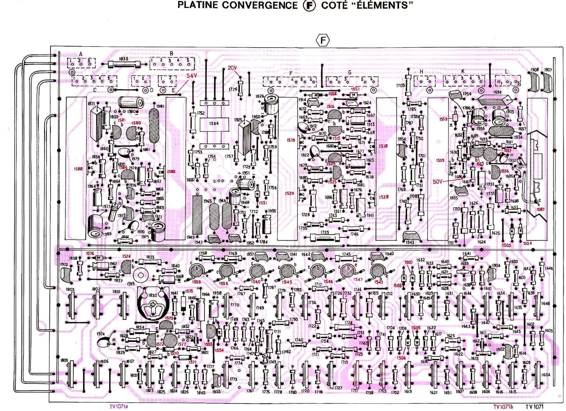 Justement, ces fameuses molettes rouges de coupures G2 sont source de panne, fuite électrique entre les broches qui font chuter les tensions G2. Il faut dessouder les 3 et faire un strappe entre les 2 contacts normalement fermés. Il n’est pas normal que la lumière soit insuffisante avec les réglages violets à fond, même avec un tube usé.