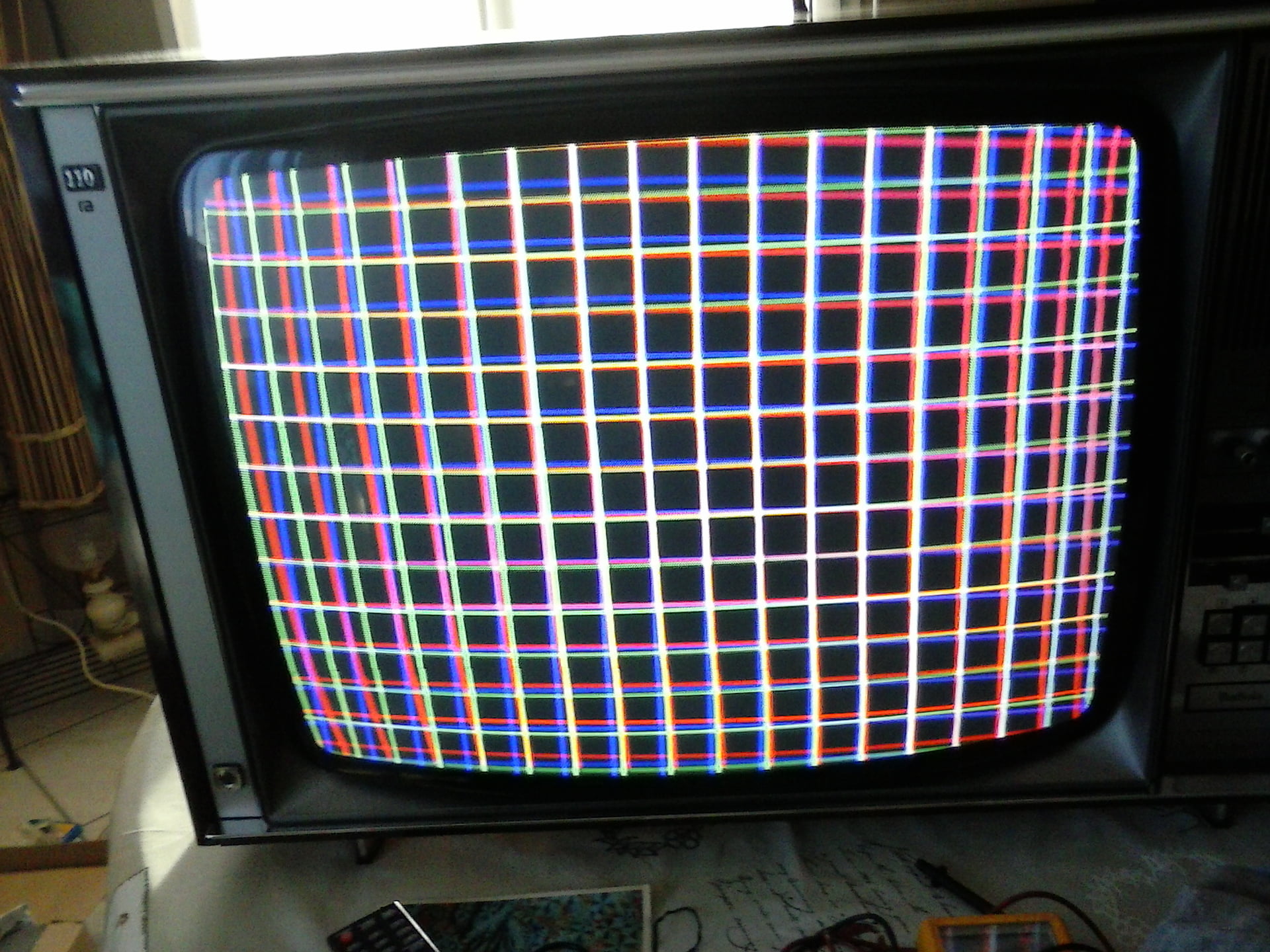 On va faire autrement : enleve la pince croco, met la tv en marche normale. Limiere et contraste a mi course, couleur au mini, et regle les g2 pour avoir une image normale sand dominante coloree
