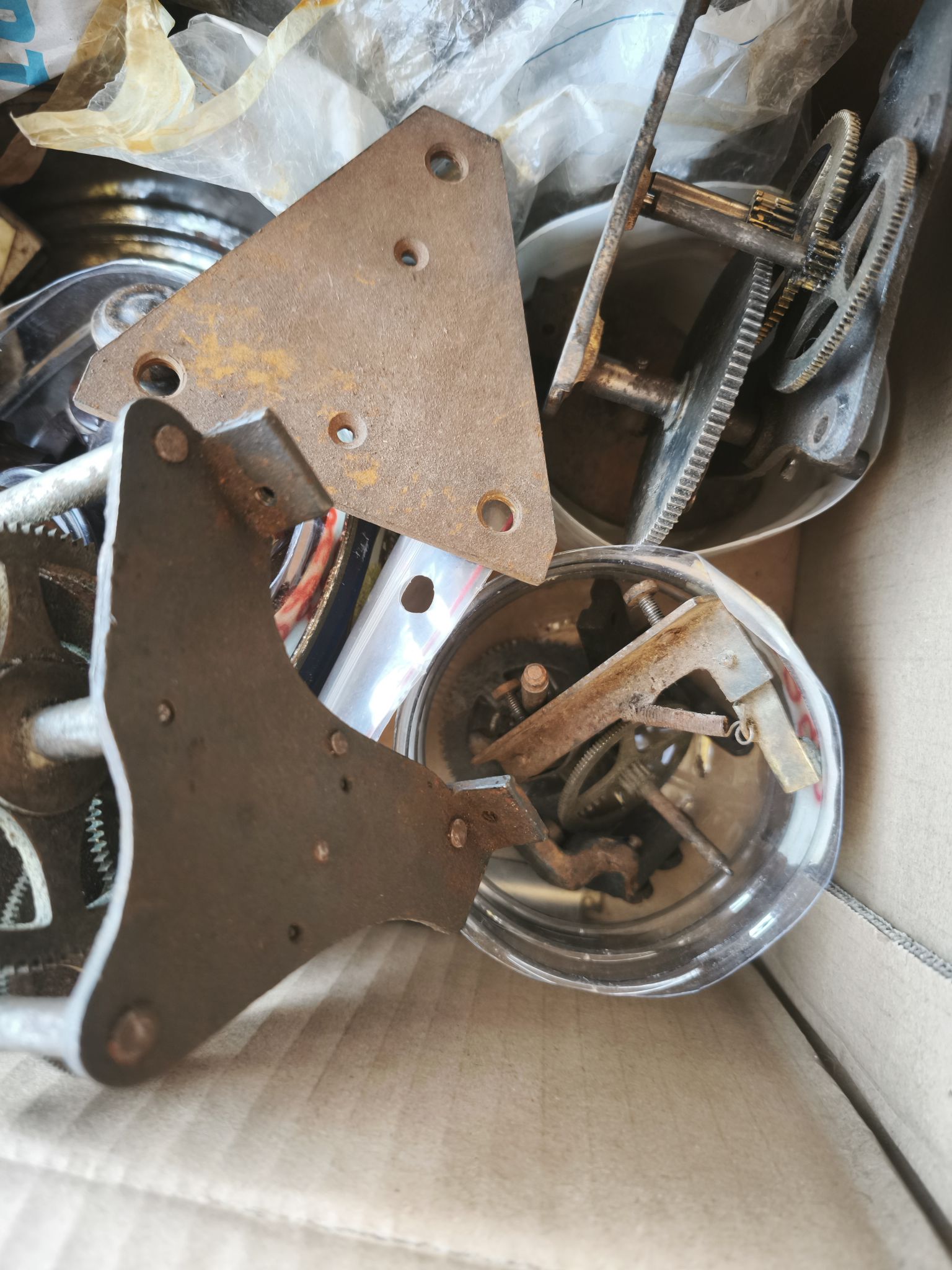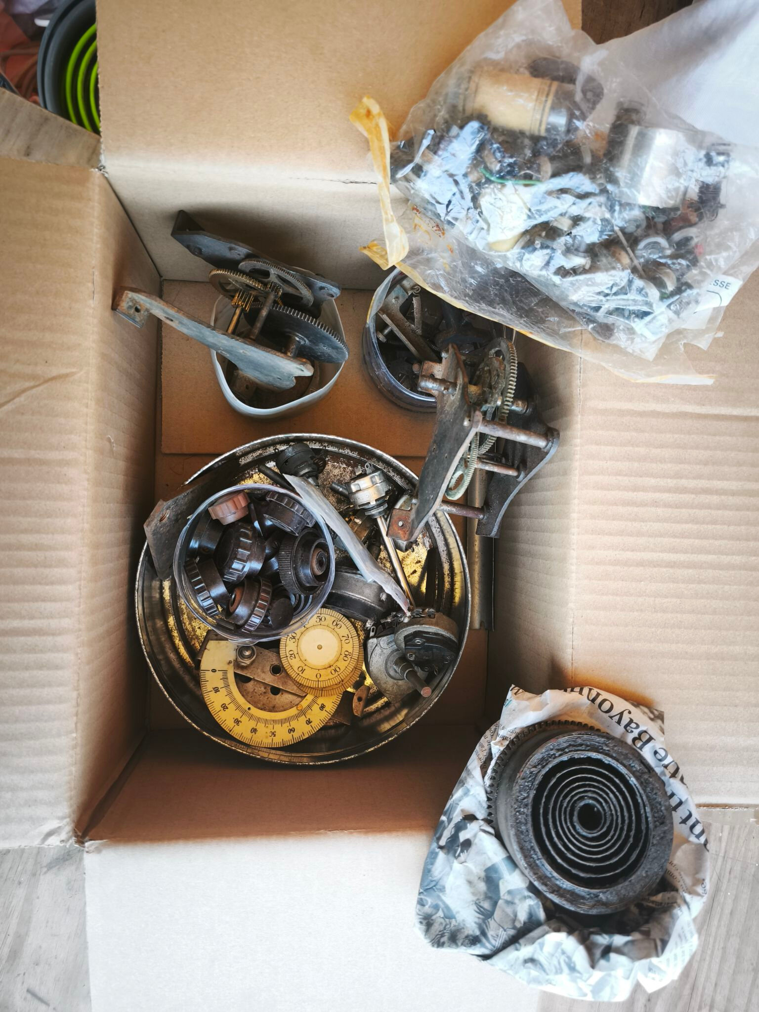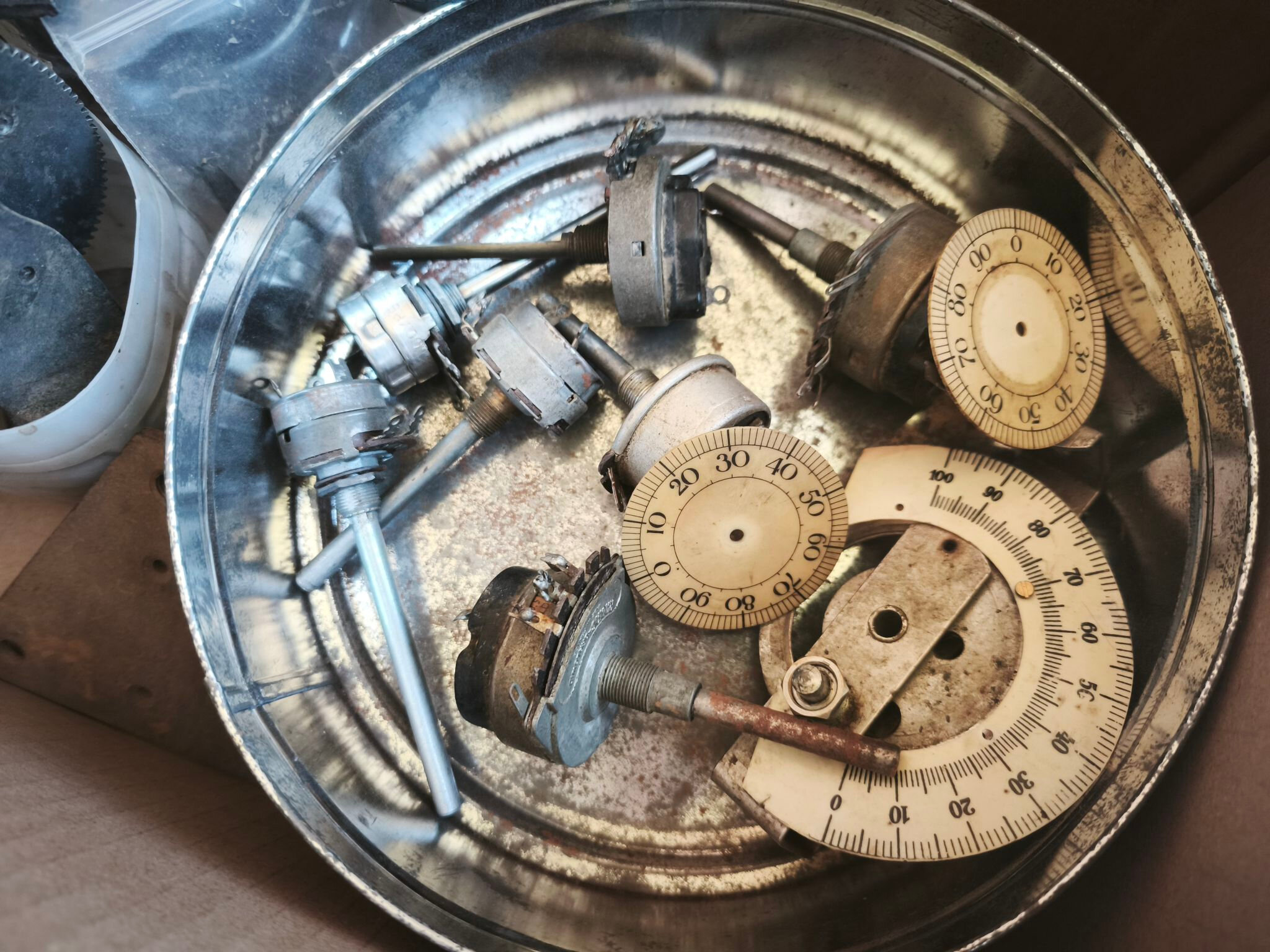 Il y a des potentiomètres avec inter Probablement de pièces de phonographe (dont un ressort, attention aux yeux), des boutons, etc …