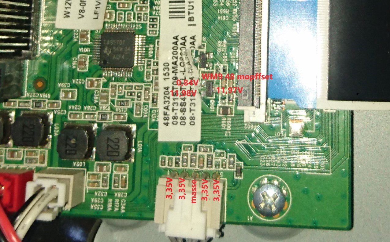 ok je vais essayer ça en attendant j’ai pris mes tensions et pas de 5V sur le module voila une photo du connecteur sur la mainboard les tensions sont les même avec ou sans modules par contre le transistor dont j ai mis les tensions me semble bizarre mais c’est un mosfet et peut etre que le test au diodemetre n’est pas le même j’ai une jonction diode entre les tensions 11,97 V et 11,98 V mais rien de l’autre coté