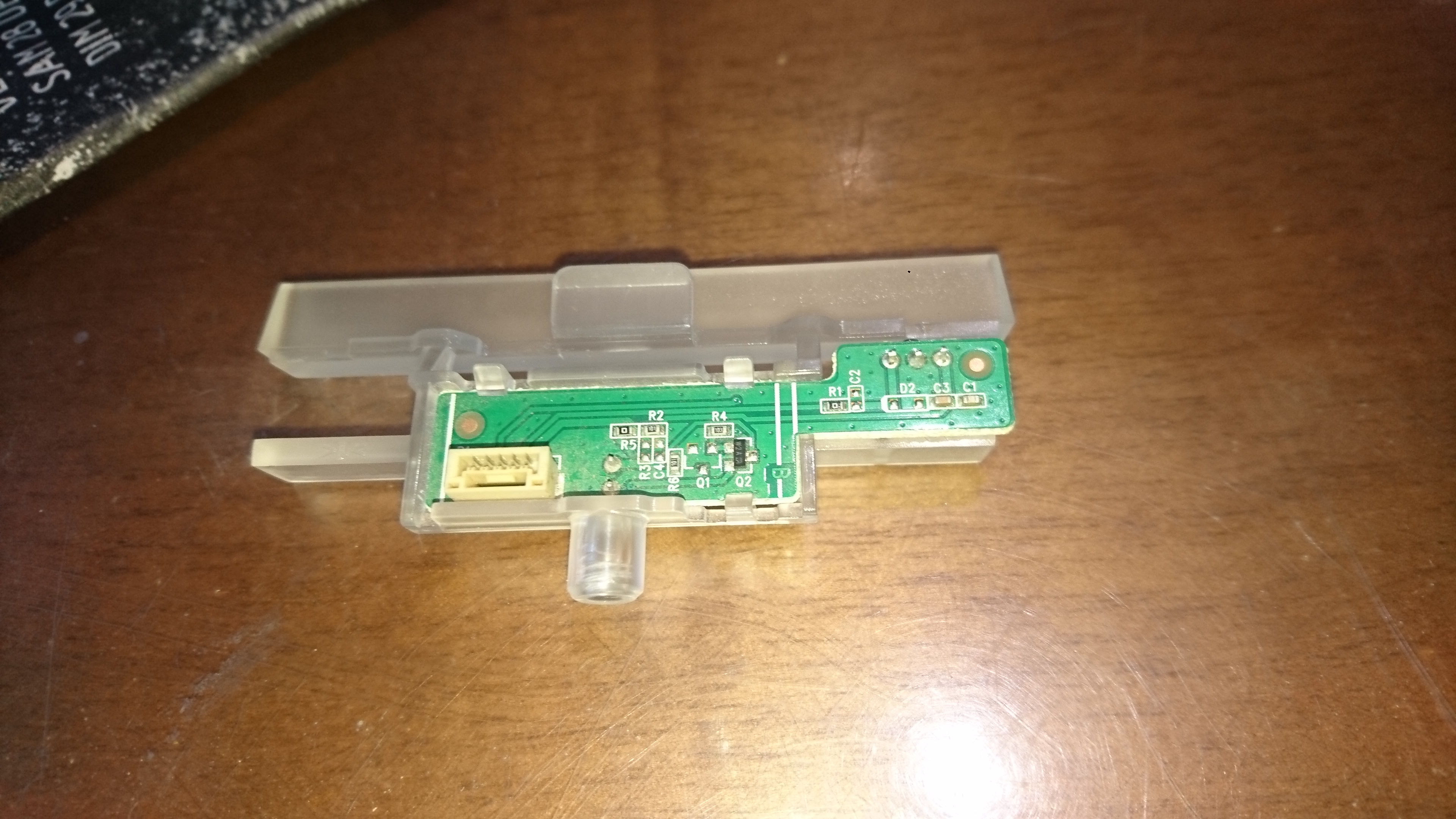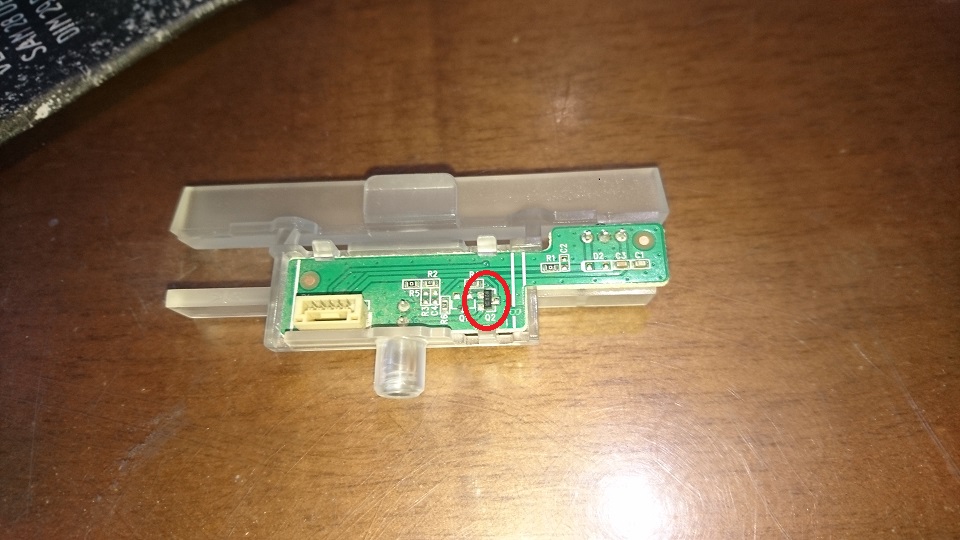 Pas de bonne augure le petit flash…à contrôler en priorité les composants actifs du récepteur IR et donc ici du transistor CMS dans le cercle rouge.