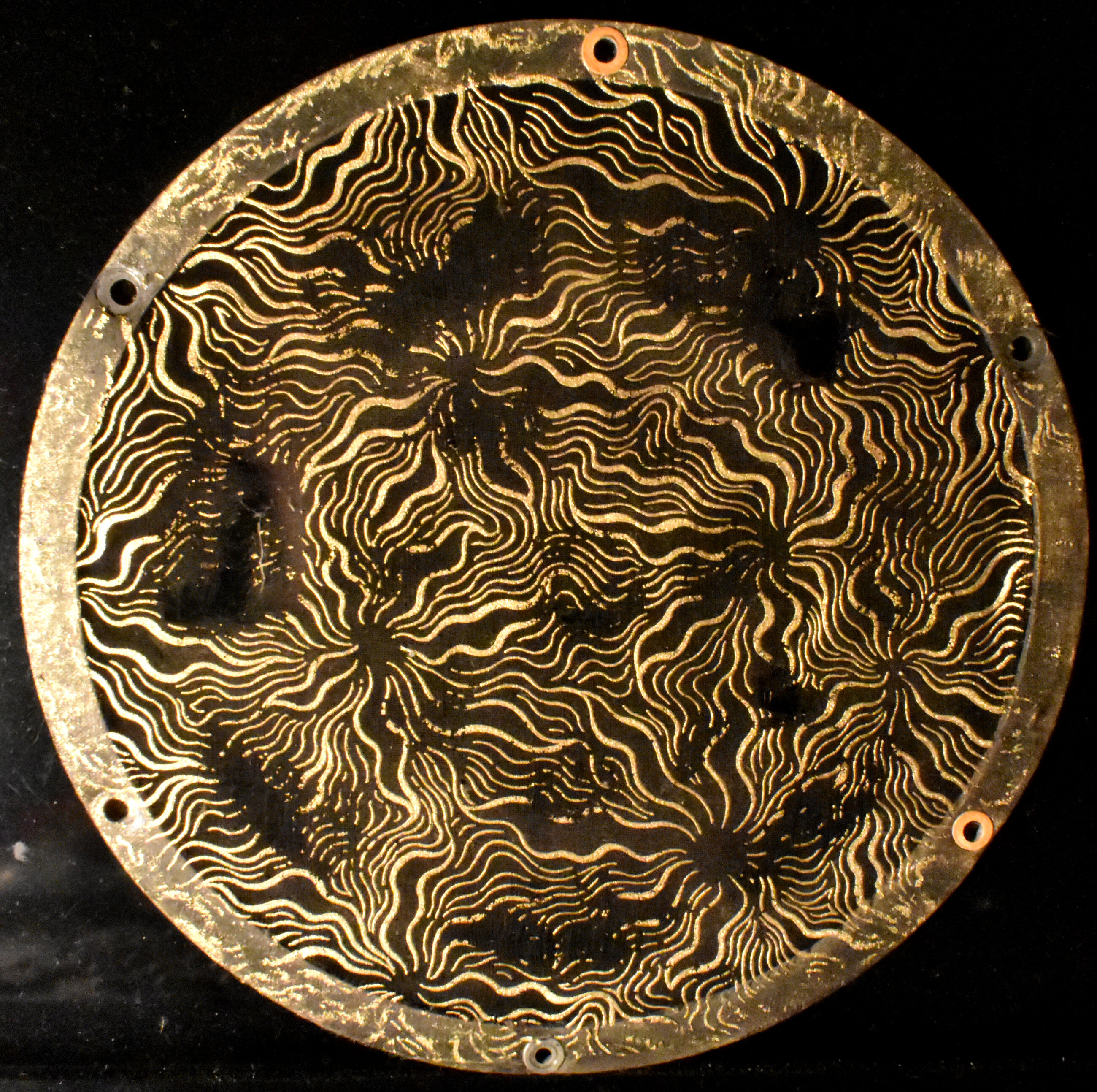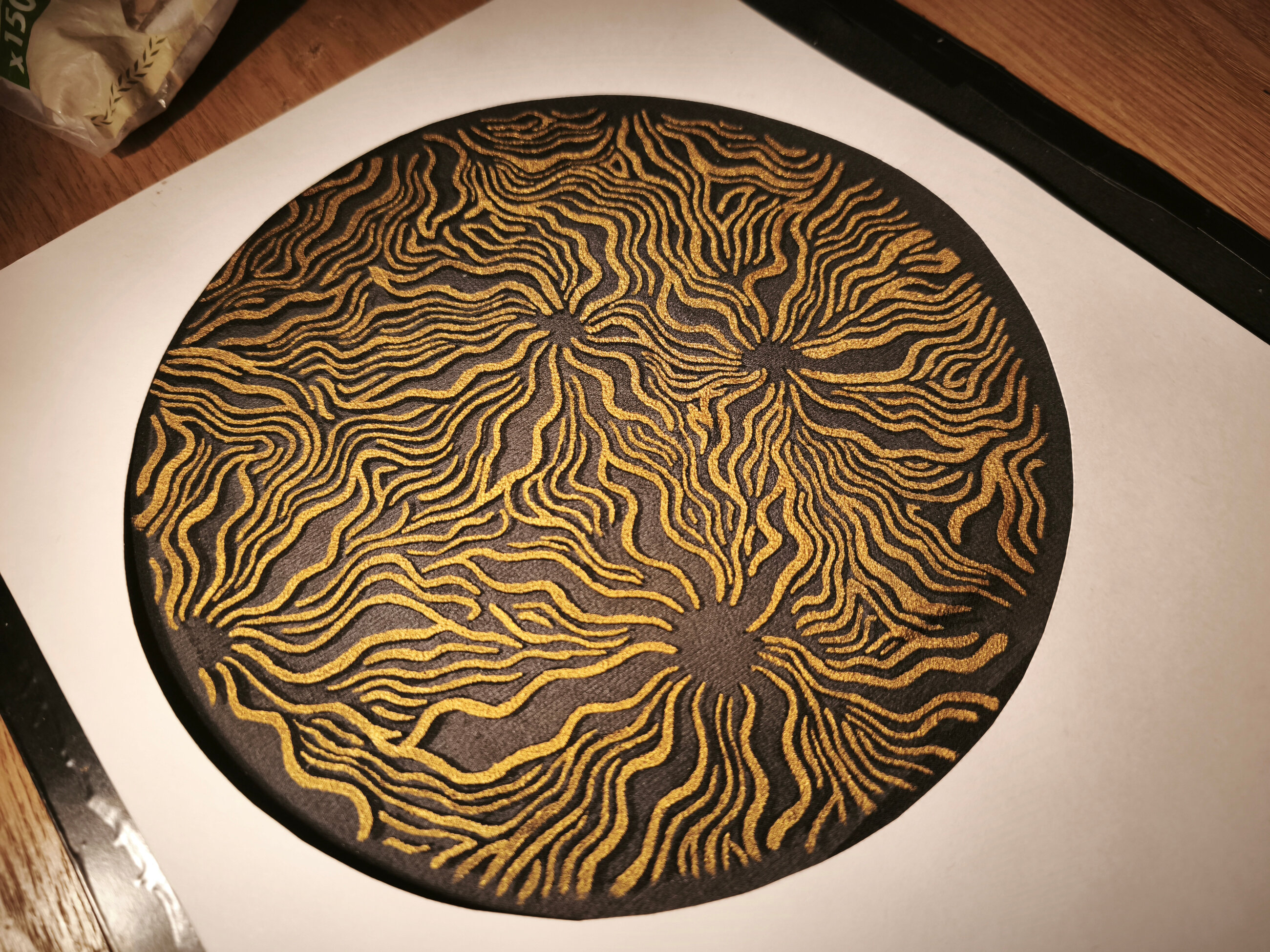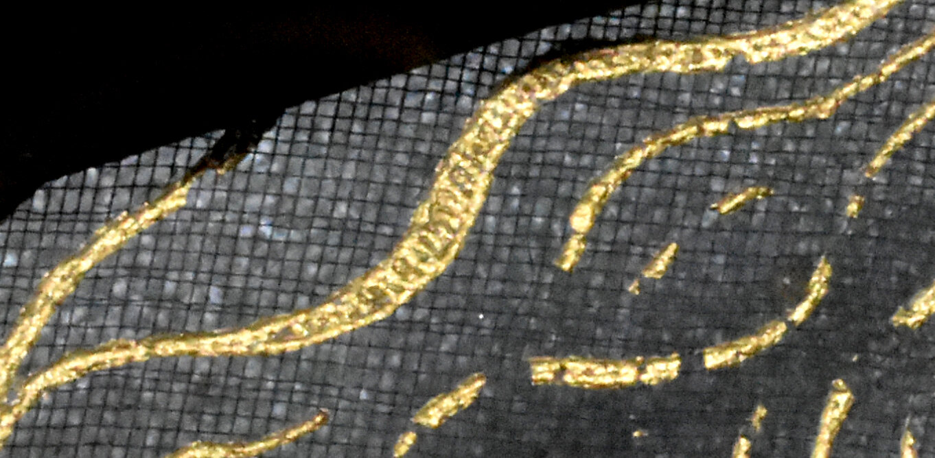 J’ai remarqué que les dessins en forme de vermiculures n’ont pas été faits au pinceau mais plutot avec une forme qui pourrait être un tampon (bois ou métal ) comme le suggérait @radiolo . Pour les plus épais on voit une trace en forme d’échelle qui s’apparente à la gravure, et qui était la plus apte à retenir l’encre, ou en l’occurrence ici la dorure.