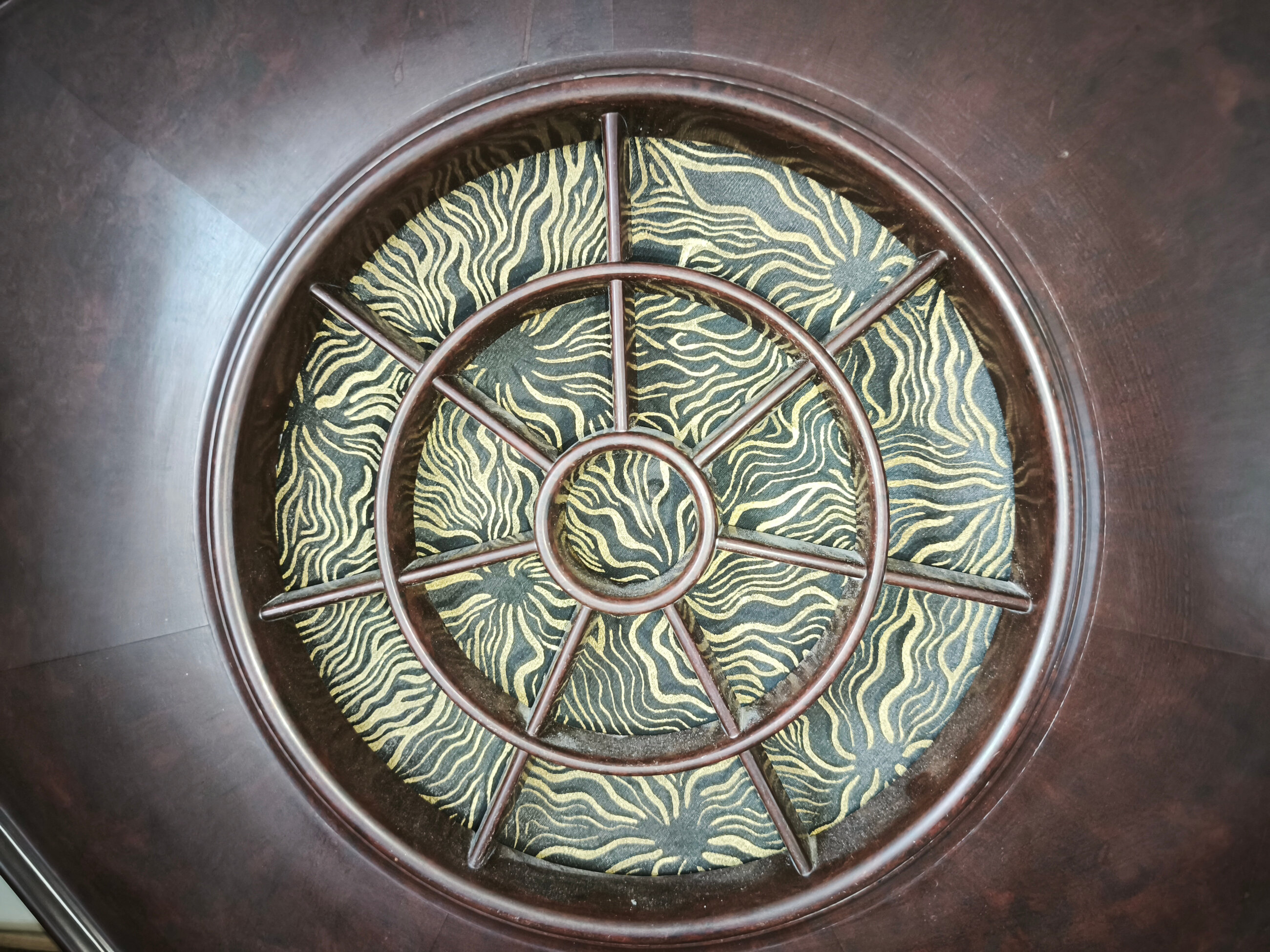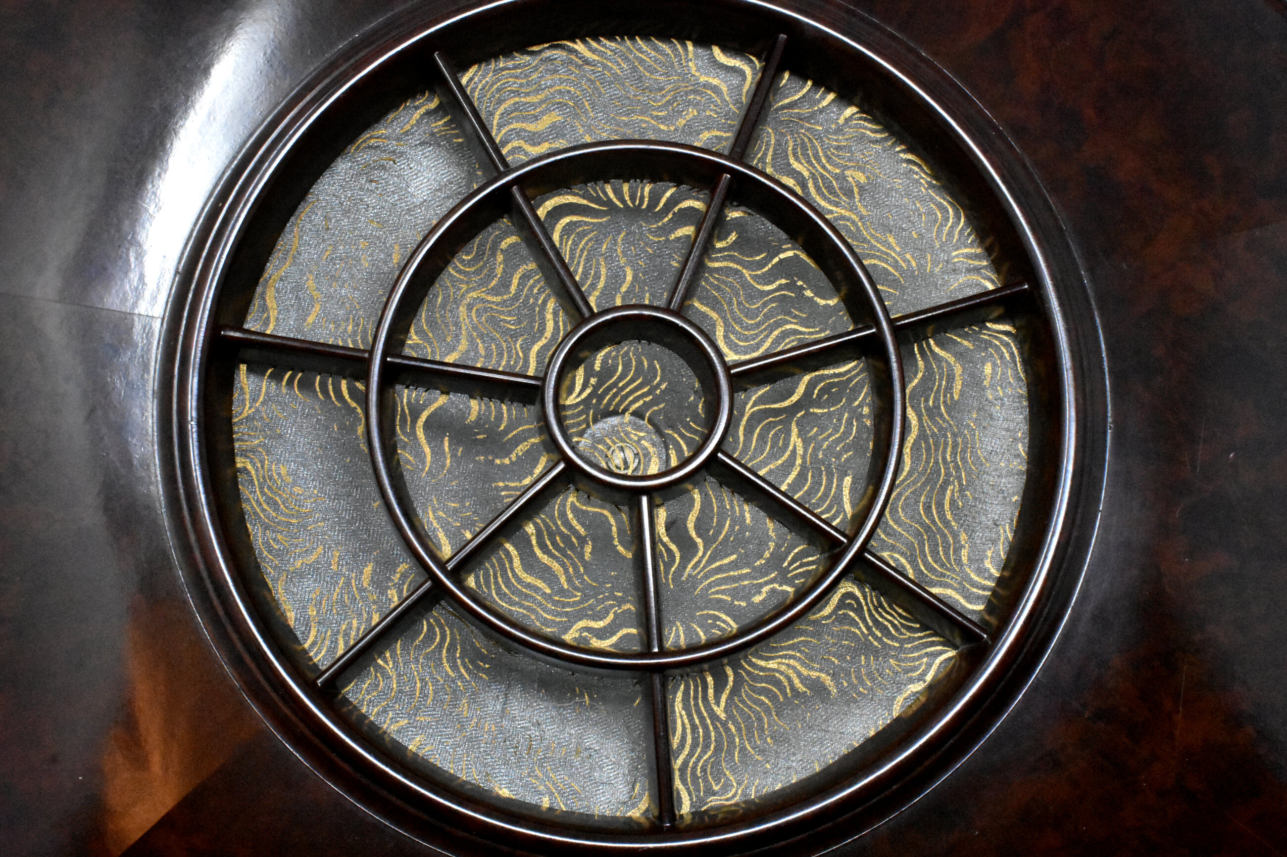 Les motifs de la toile du 2019 sont décentrés vers la gauche derrière la grille circulaire.