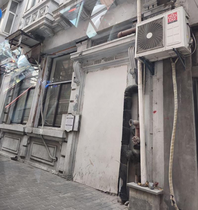 Ce que j’ai trouvé comique c’est l’installation souvent scabreuse des unités extérieures des climatisations, comme ici dans une rue de Shanghai … (les tuyaux passés à travers l’appui de fenêtre plus ou moins réparé ensuite) :