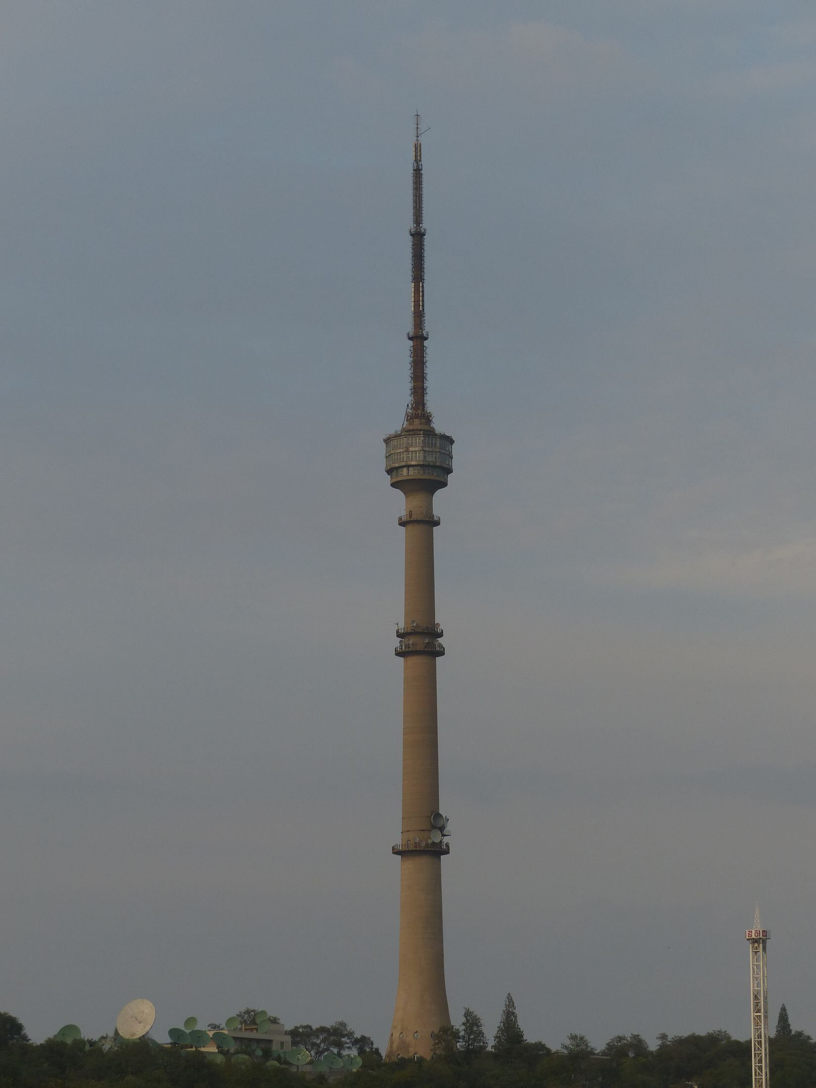 Partie haute au-delà de la deuxième plate-forme : trois ensembles de panneaux d’émission UHF. Chaque ensemble (stack) diffuse un canal UHF, soit ici trois canaux. La norme de diffusion TNT utilisée est le système DTMB. Le diagramme de rayonnement est principalement orienté entre 180° et 300°, du fait de la position de Shangai en bordure de Mer de Chine.