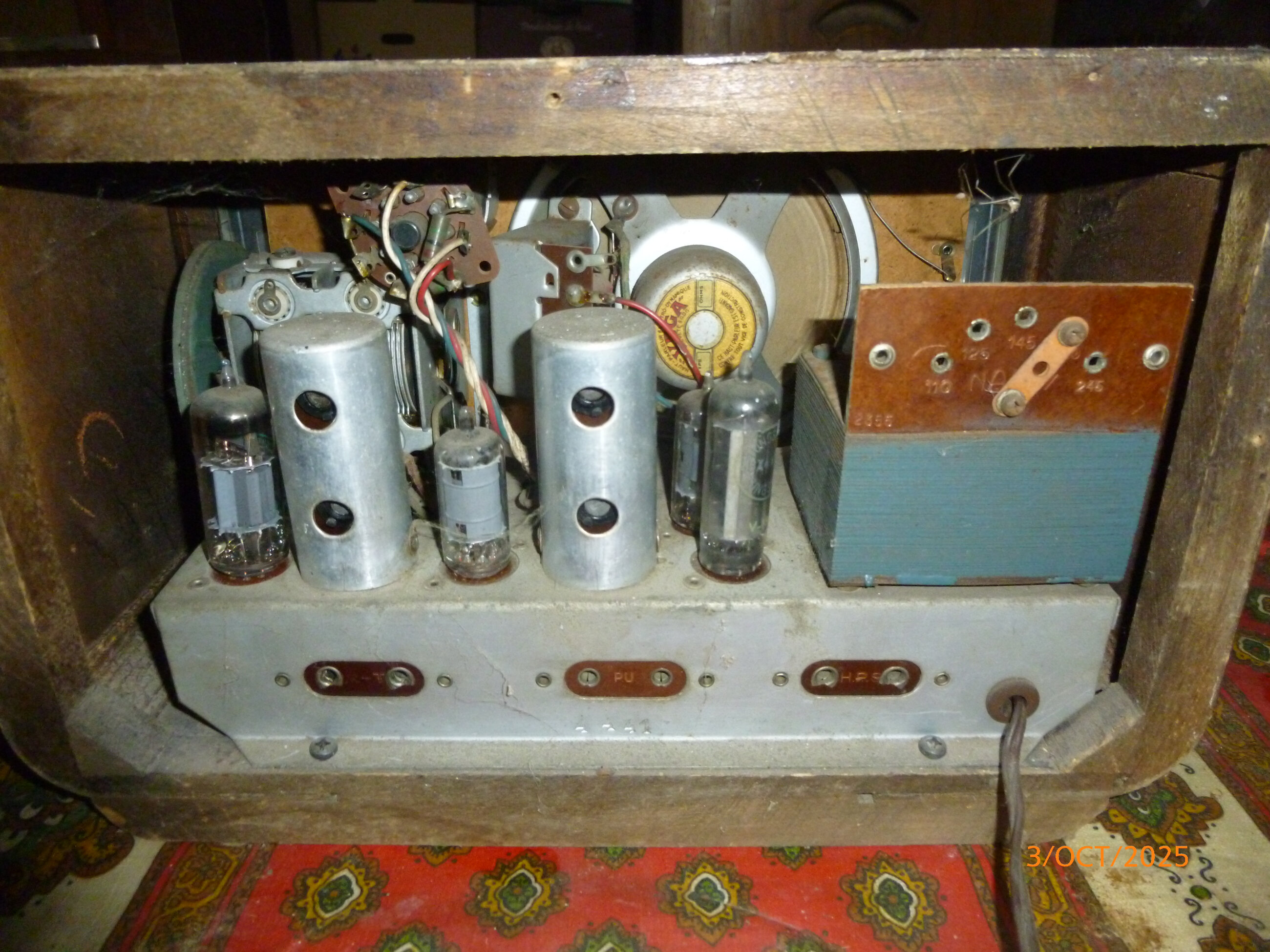 6 lampes : EL**?, 6BA6, 6BX4,6BA6,absente derrière le transfo., EM34