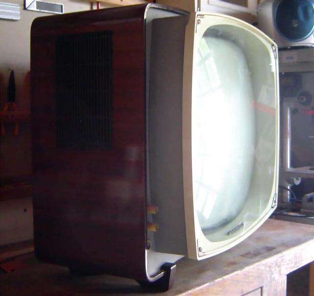 Mes parents ont acheté leur premier TV en 1961, un Schneider 49 cm /110°utilisant l’ébénisterie de son prédécesseur 43 cm / 90, ce qui fait que le seul bénéfice de la réduction de profondeur du tube était la suppression de l’excroissance protégeant le tube sur le carton arrière.