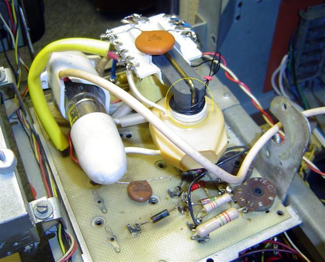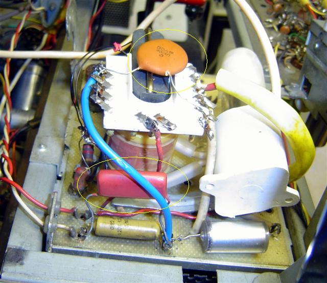 Une autre vue de la THT, cerclés en jaune, le 270 NF rajouté en parallèle sur le condensateur de S en série avec le déviateur ligne (diminution de la largeur et de l’effet de «pincement» sur les deux cotés de l’image) ainsi que le 100PF à la place du 200PF d’origine (condensateur d’accord) .