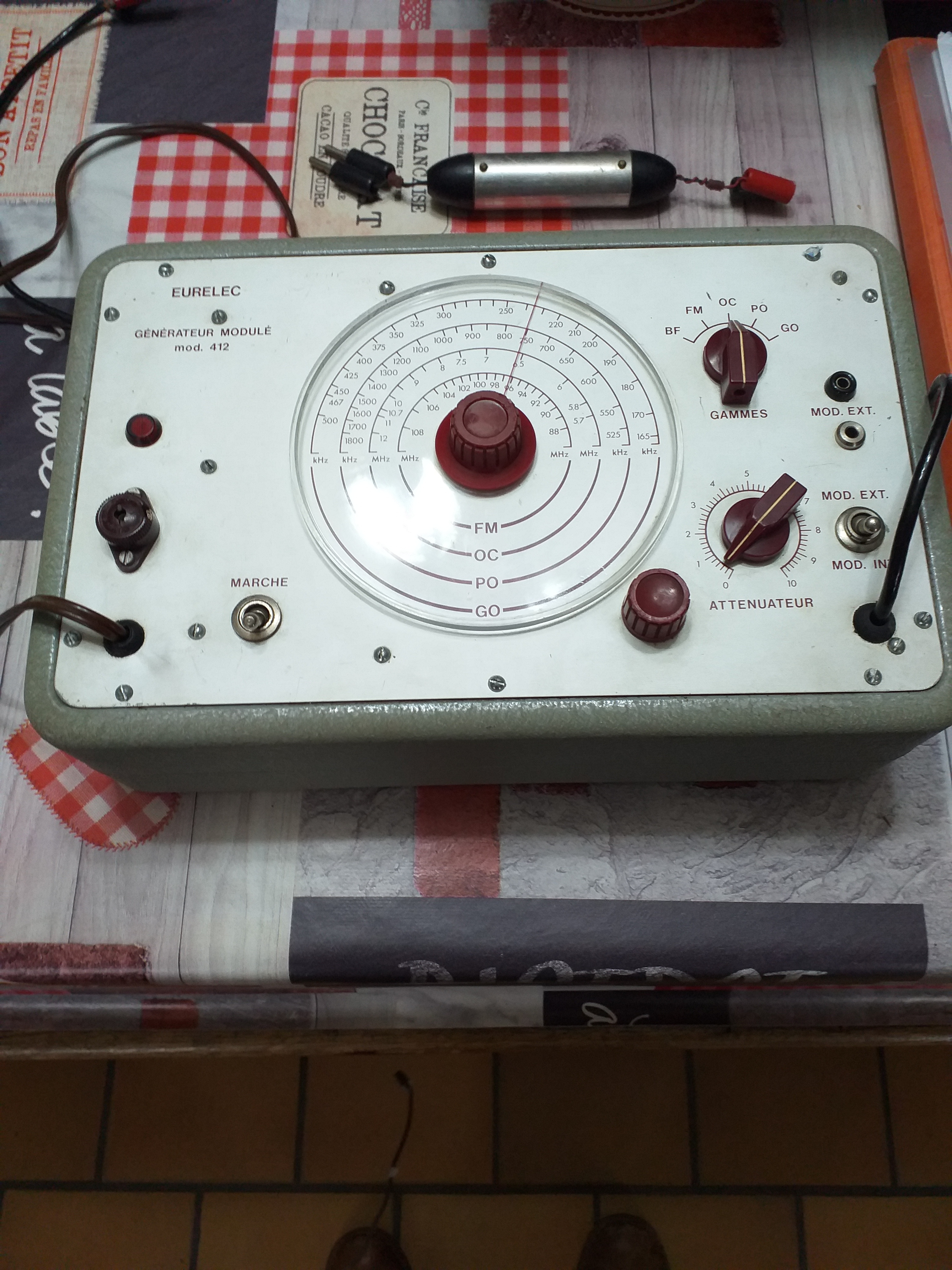 c’est un appareil de mersure basique de chez Eurelec …Mais, pour une fois (et contrairement au lampemètre Eurelec, ou au contrôleur universel Eurelec, qui sont des bouses d’une précision hectométrique !) Ce géné H.F est, certes, basique, mais plutôt bien conçu, et assez bien étalonné (sous réserve , bien entendu, quil nait pas été mal monté, ou mal utilisé …)