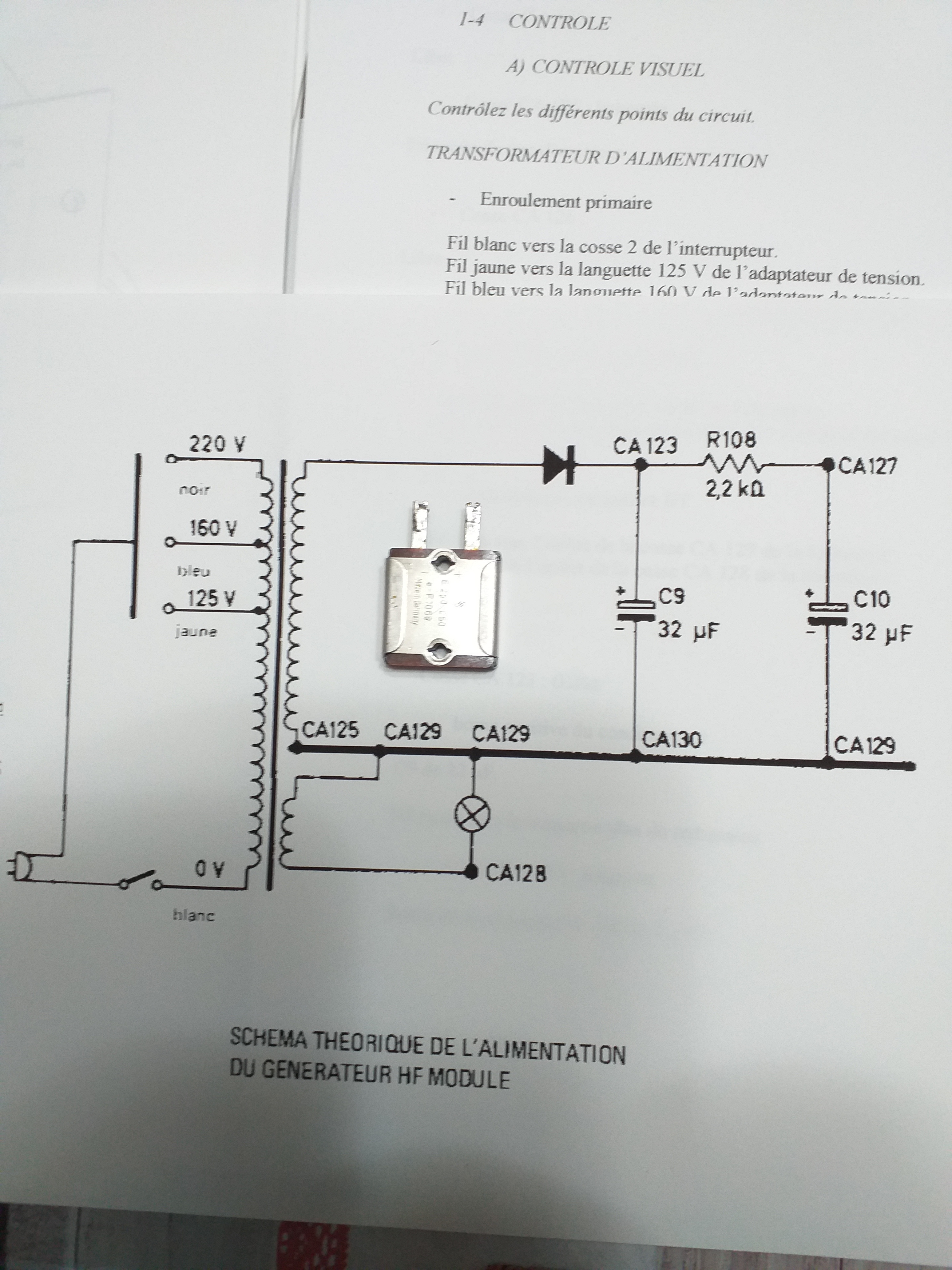 Pouvez vous me dire quelle diode je pourrai metre pour remplacer ce que j’ ai photographier et d’ apres ce schéma sotie du secondaire 200V cette alime va sur le générateur Eurelec model 412 . j’ ai mesuré Vloss 72% C 1099 pF sur ce redresseur .