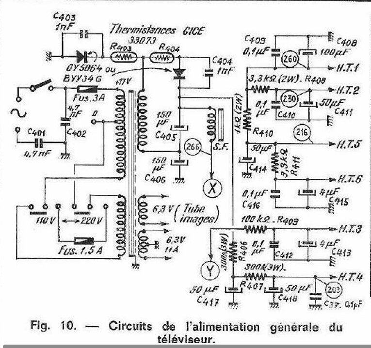 ce genre d’ alimentation se trouvait aussi sur la plupart des TV Grammont du milieu des années 1960 : doubleur Latour avec deux diodes au silicium ( BY114 ? ) et deux condensateurs de 150µF !