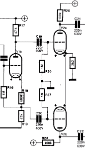 — En cas de montage stéréo, on peut n’utiliser qu’une seule ECC88 en premier préampli pour les 2 amplis ! J’avais vu des schémas utilisant ce montage, avec des ECC83/EL34, par exemple celui-ci :