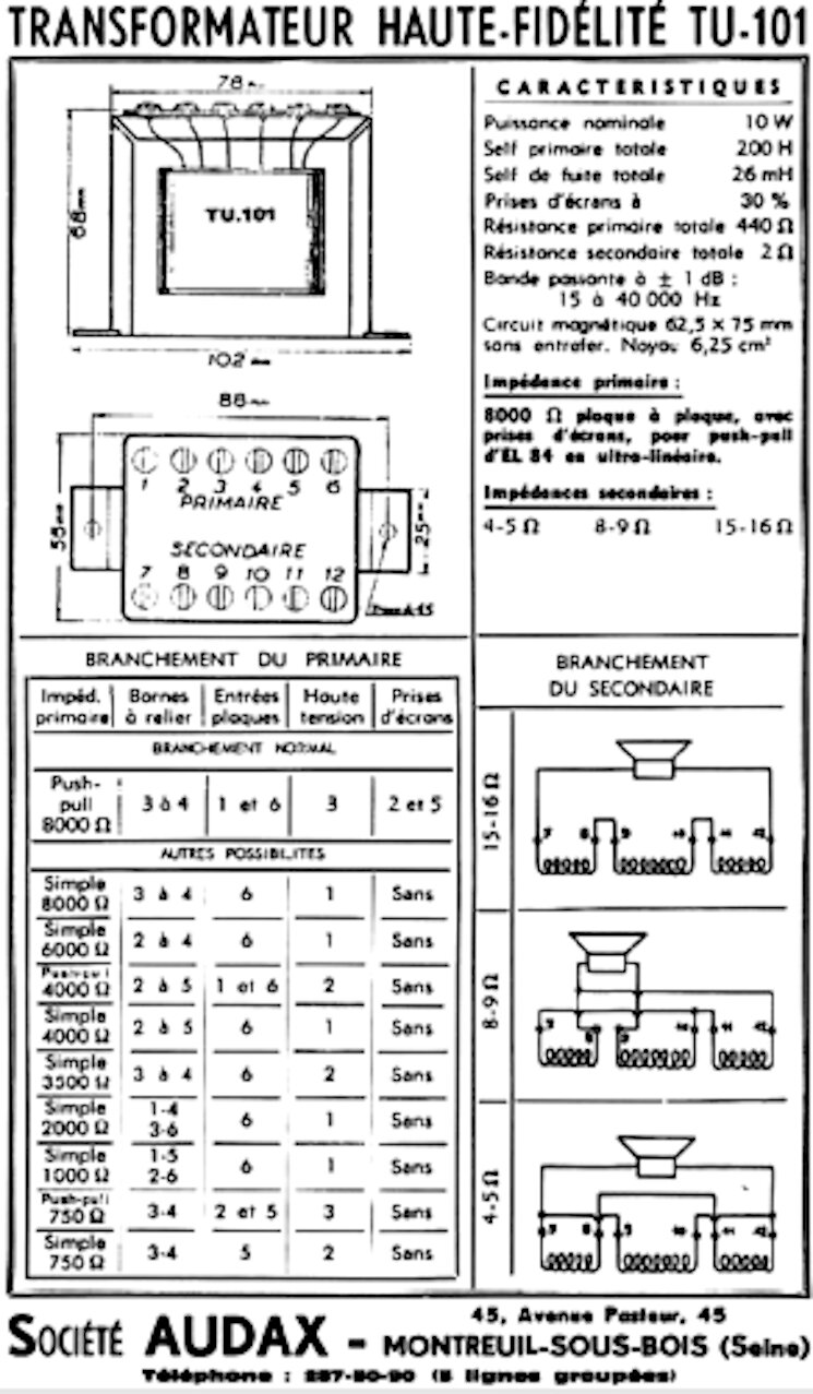 Bonjour voila les caractéristiques et branchements du véritable et originel TU101 de Audax , en plus il a la possibilité de faire soit un montage ordinaire en sortie ‹ › linéaire ‹ › et aussi en sortie ‹ › ultra linéaire ‹ › , outre de pouvoir en plus le configurer sous diverses impédances de sortie … …