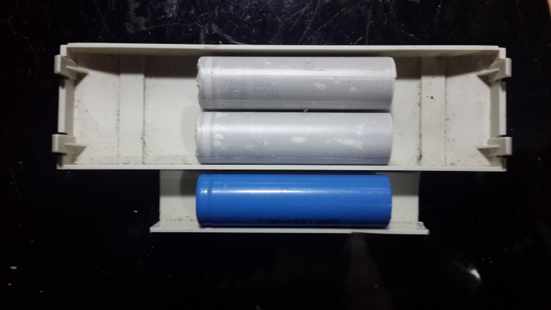 — Mais c’est pas tout : il me fallait réaliser le bac à batteries ! Comme les 18650 sont d’un format spécial, je me suis “fagoté” un bac “sur mesures” avec de vieux “bouchons” de faces avant d’ordinateurs :