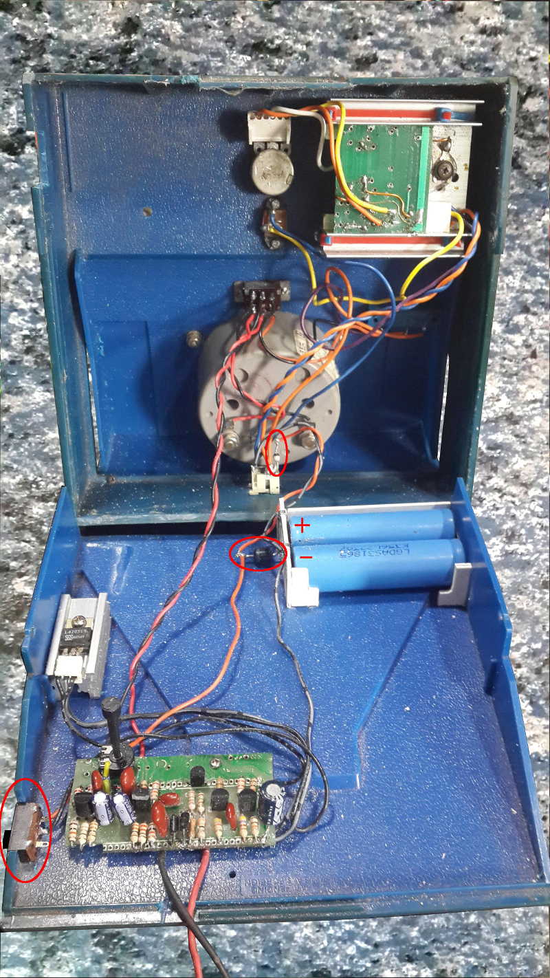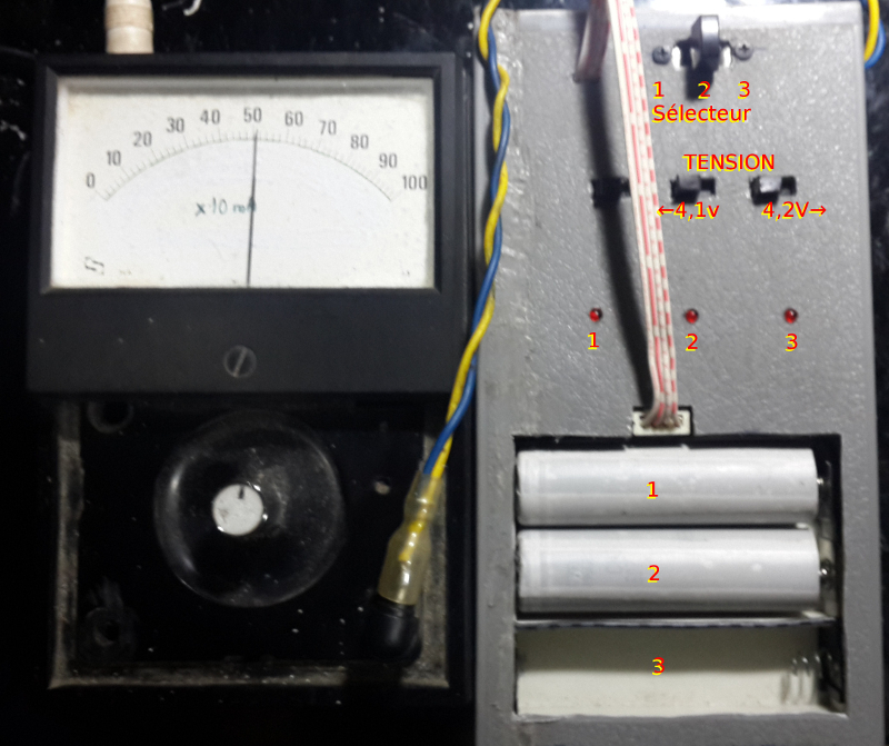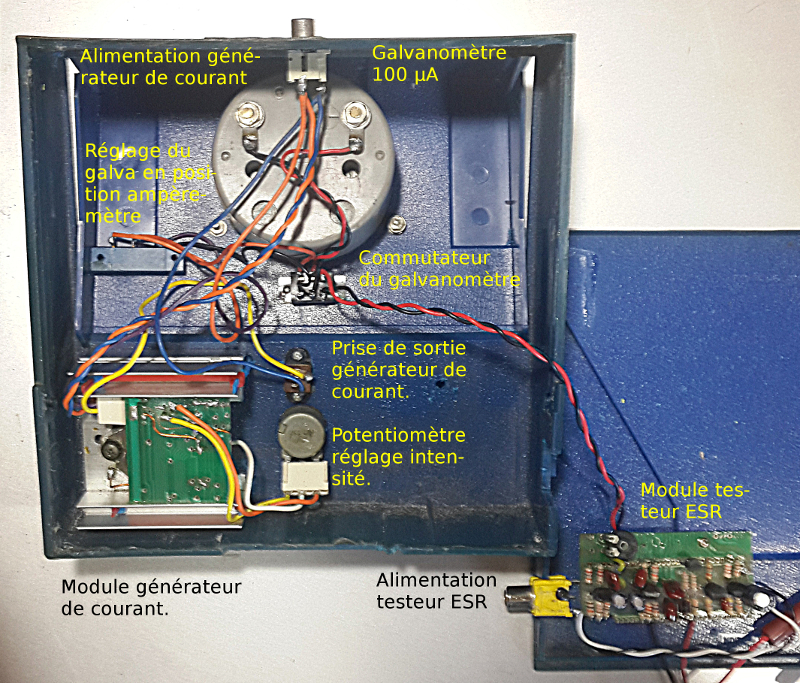 , et le montai dans le boîtier, fixé par une vis sur la base ! Il fonctionne “au millipoil” ! Le tarage du zéro se fait au moyen du potentiomètre ajustable noir. Un commutateur rajouté sur la façade du pupitre permet de commuter le galvanomètre sur “Charge batteries” ou “Test ESR” ! Mieux : une fois des batteries à charger dans le bac et le courant de charge réglé, on bascule sur “Test ESR” et on teste des condensateurs sur une plaque avant récup’ :