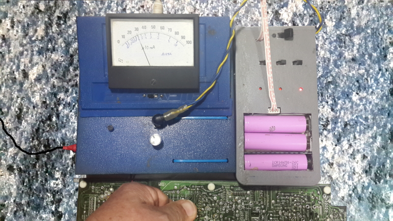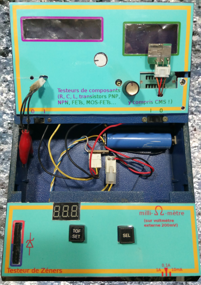 , lui aussi équipé d’un bac à batteries, mais pas pour le chargeur Li-Ion ! Car ce même boîtier avec le même galvanomètre renferme aussi un testeur ESR pour tester la résistance série de condensateurs électrochimiques !