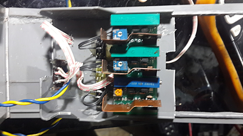 - Régler les ajustables multitours de 10k pour avoir 4,1V en sortie, dans le bac à batteries (mesurer directement aux bornes !).