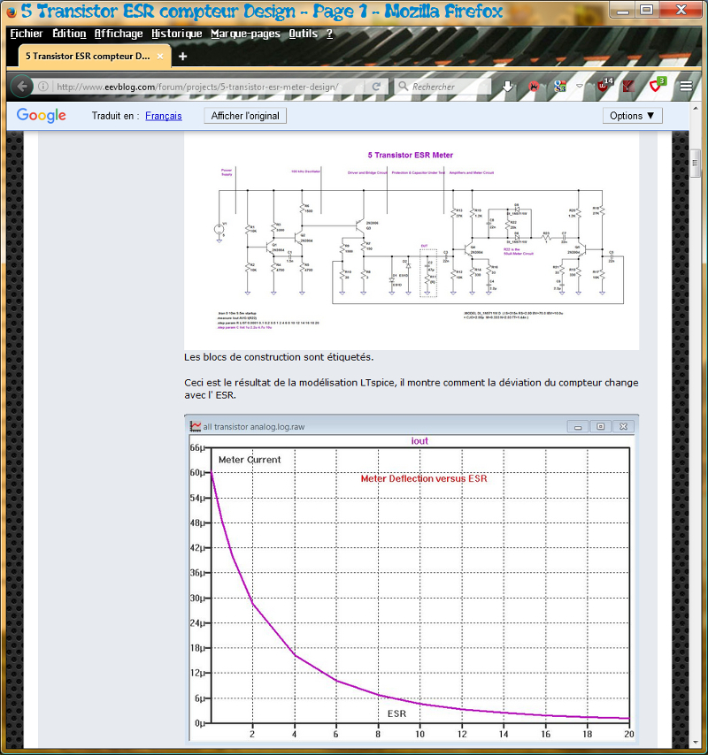 — En recherche sur le Net pour trouver un schéma, un jour, je “tombe” (sans me blesser !) sur un site anglophone décrivant un testeur ESR à 5 transistors, avec toutes les explications utiles et nécessaires pour en comprendre le fonctionnement ! Exactement ce qu’il me fallait ! Aussitôt, je “dégainai” mon traducteur :