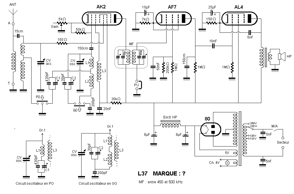 Bonjour. J’ai déjà, a plusieurs reprises, conçus quelques petits postes avec ce genre de montages. Le but, était pour moi, d’utiliser le moins de tubes possible. Du coup, avec une ECH81, une ECL80, une 1N4007, et une diode de détection quelconque (ça fonctionne également avec une 4148 !), on peut construire, un superhétérodyne, minuscule, et, pour le moins économique ! Vraiment dommage, qu’il n’y ait plus grand chose a écouter, car c’était très amusant !